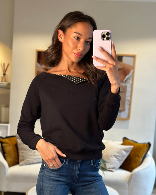 Saint Laurent Black Jumper with Leather Collar & Stud Details Size FR 36 (UK 8)