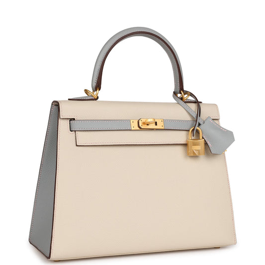 Hermes Special Order (HSS) Kelly Sellier 25 Craie and Bleu Glacier Epsom Brushed Gold Hardware