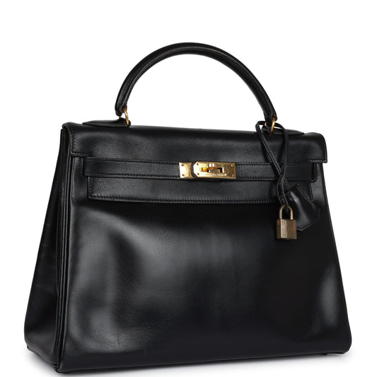 Vintage Hermes Kelly Retourne 32 Black Box Gold Hardware