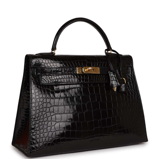 Hermes Kelly Sellier 32 Black Shiny Porosus Crocodile Gold Hardware