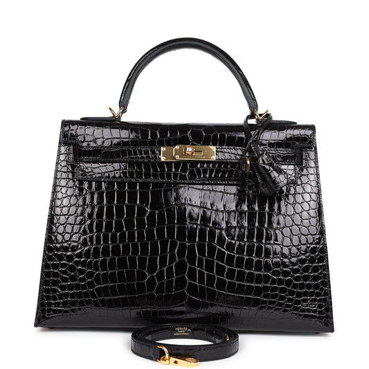 Hermes Kelly Sellier 32 Black Shiny Porosus Crocodile Gold Hardware