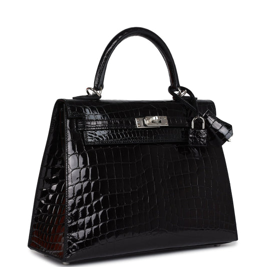 Hermes Kelly Sellier 25 Black Shiny Niloticus Crocodile Palladium Hardware