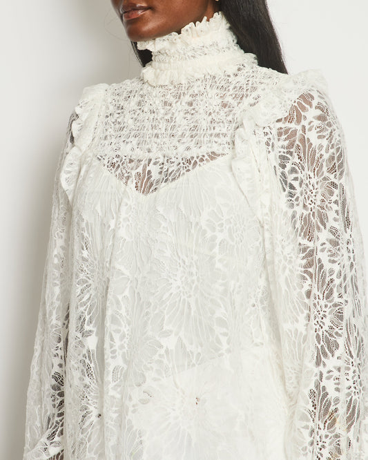 Saint Laurent Cream Sheer Long-Sleeve Lace Ruffled High-Neck Blouse Size UK 8-10