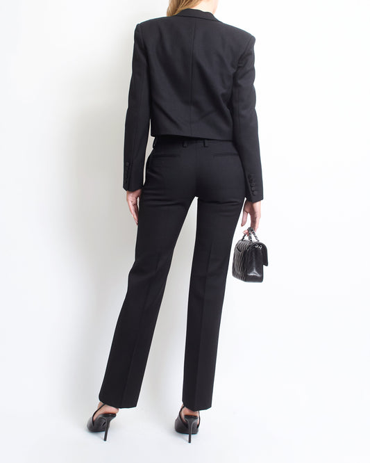 Saint Laurent Black Cropped Tuxedo Jacket with Matching Suit Trousers with Satin Detail FR 36 (UK 8)