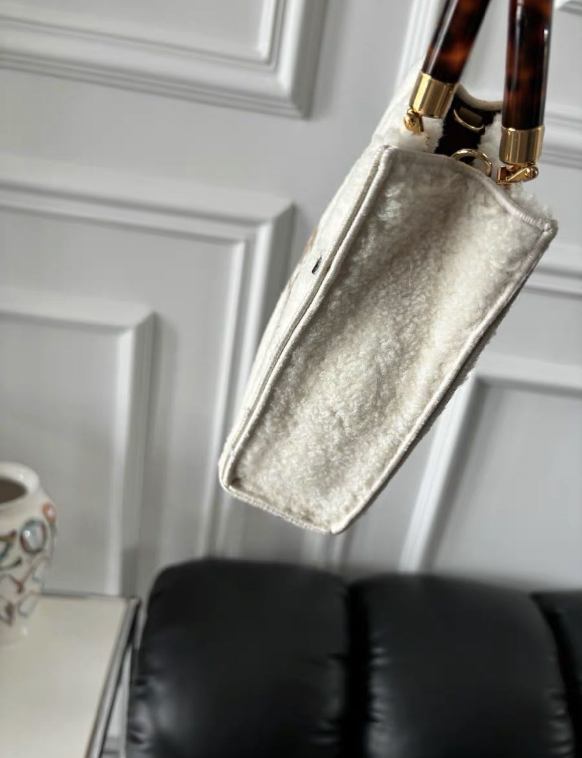 FENDI Sunshine Shopper mini leather-trimmed shearling tote