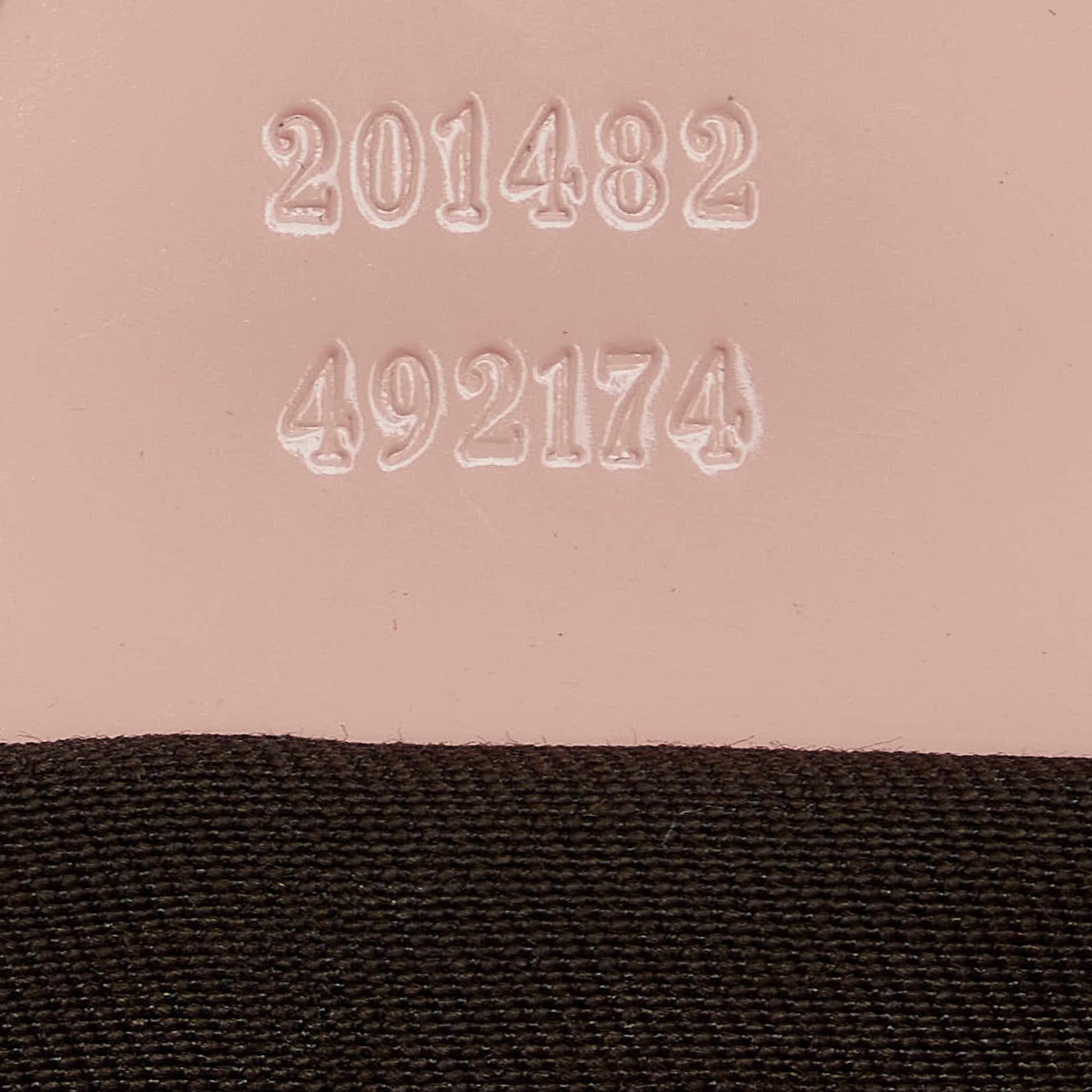 Product Details: Brown Gucci GG Supreme Joy Tote. This tote bag features a coated canvas body with leather trim, rolled leather handles, an open top with a magnetic snap button closure, and an interior slip pocket. 13" L x 16.9" W x 8.7" D, 5.5" drop. Serial number 201482.