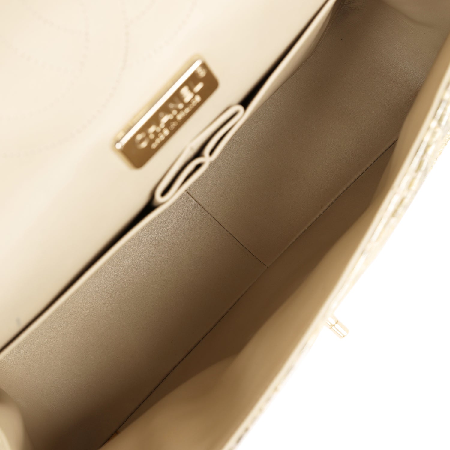 The interior is lined in beige leather with the "love letter" zipper compartment underneath the first flap, an "outer" slit pocket under the second flap, and an interior compartment with two open pockets separated by a "lipstick" compartment.