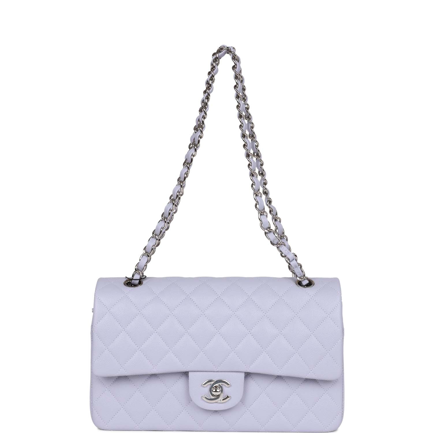This Medium Classic Double Flap bag is in Light Purple caviar leather with silver hardware, front flap with CC turnlock closure, half moon back pocket, interwoven silver tone chain link and light purple leather shoulder/crossbody strap.