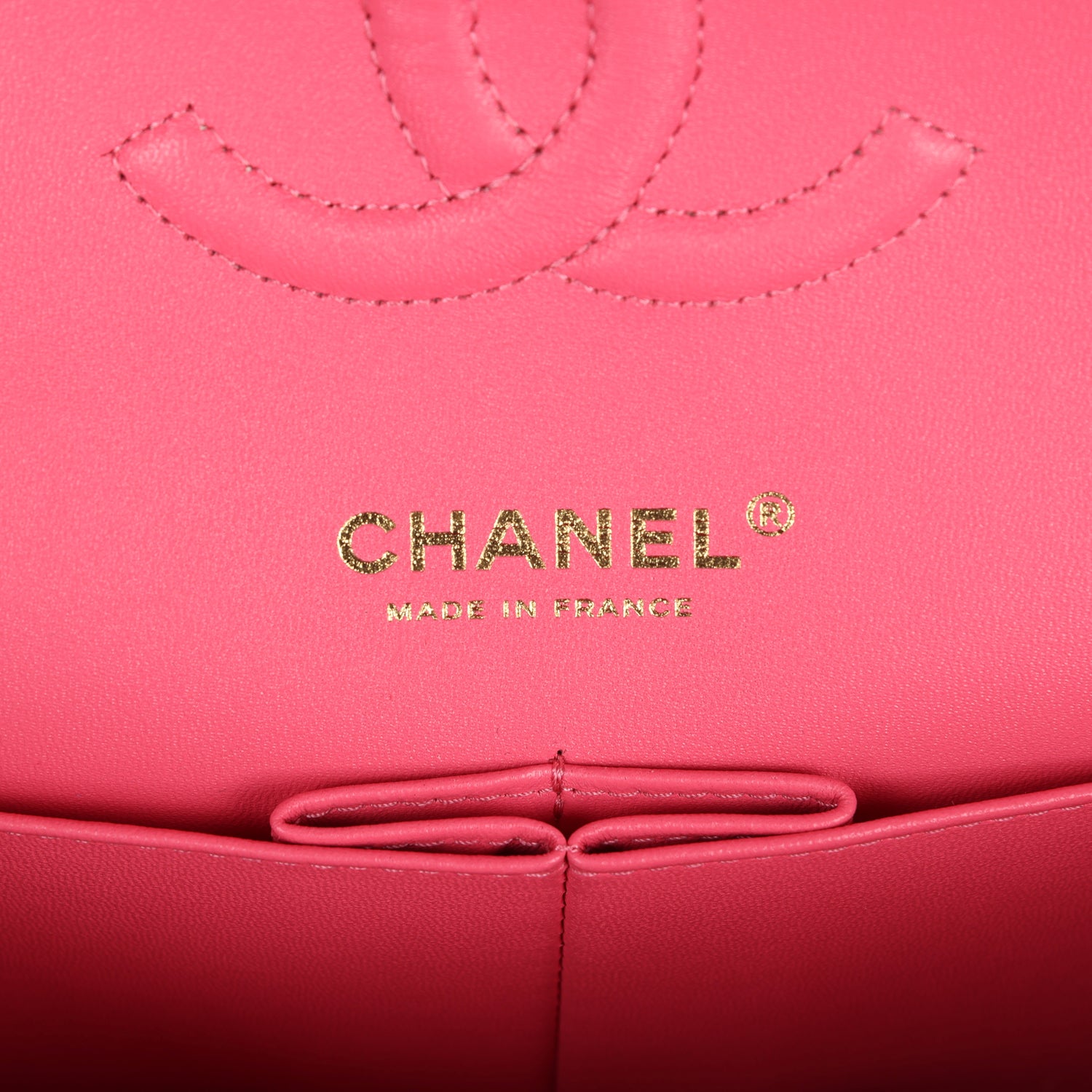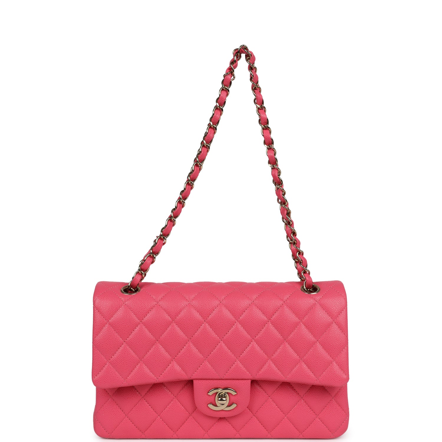 This Medium Classic Double Flap bag is in hot pink shiny caviar leather with light gold tone hardware and features a front flap with signature CC turnlock closure, half moon back pocket, and adjustable interwoven light gold tone chain link and hot pink leather shoulder strap.