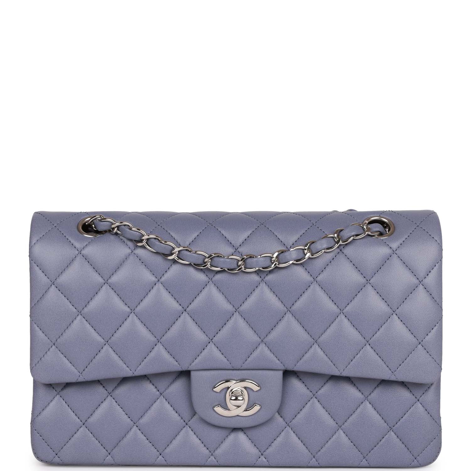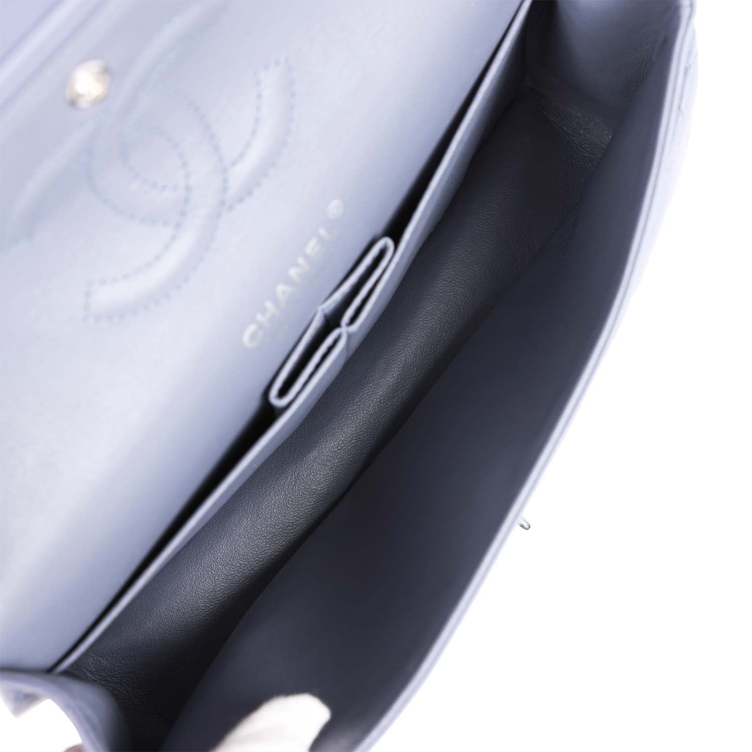 This Medium Classic Double Flap bag is in Purple lambskin leather with silver tone hardware and features a front flap with signature CC turnlock closure, half moon back pocket, and adjustable interwoven silver tone chain link and purple leather shoulder strap.