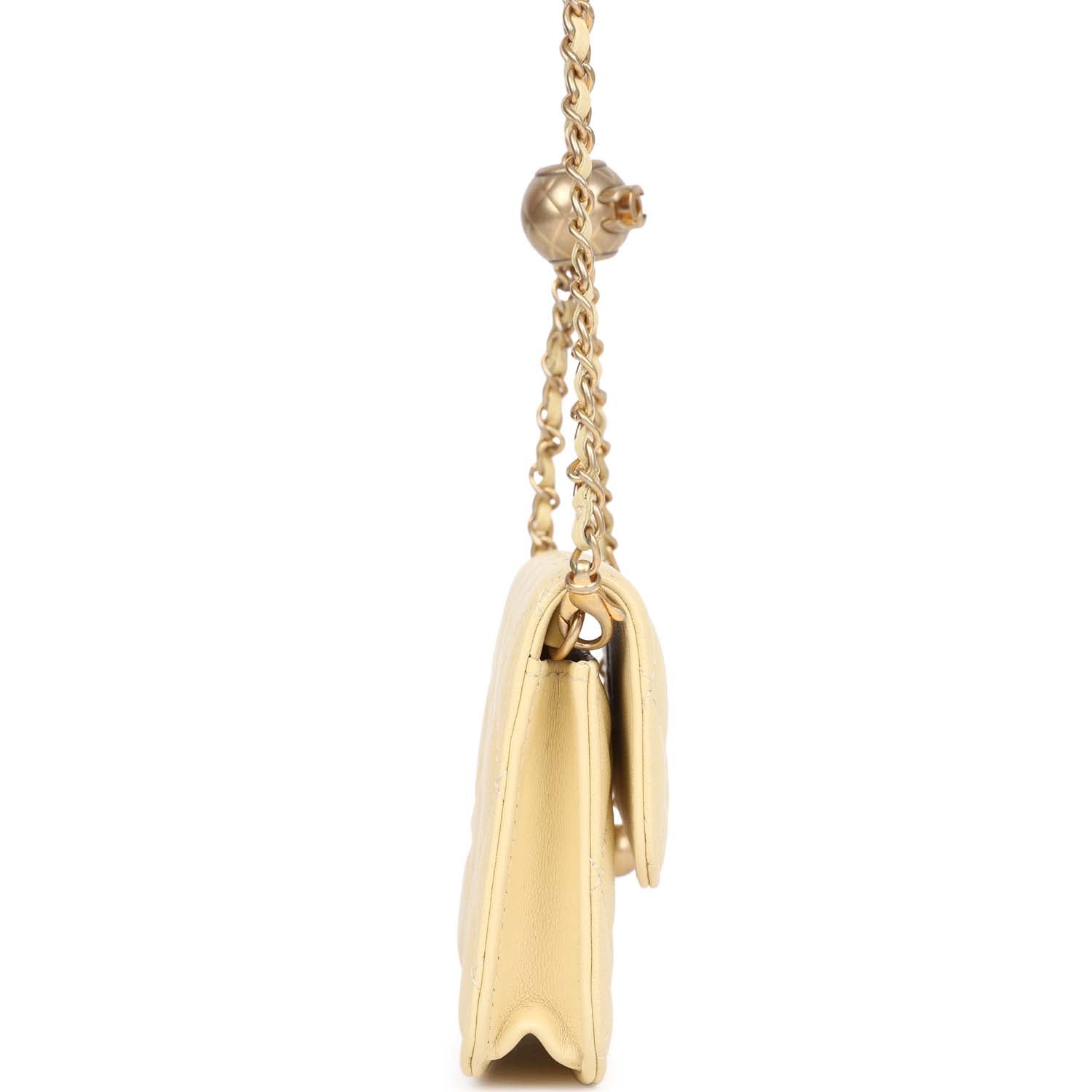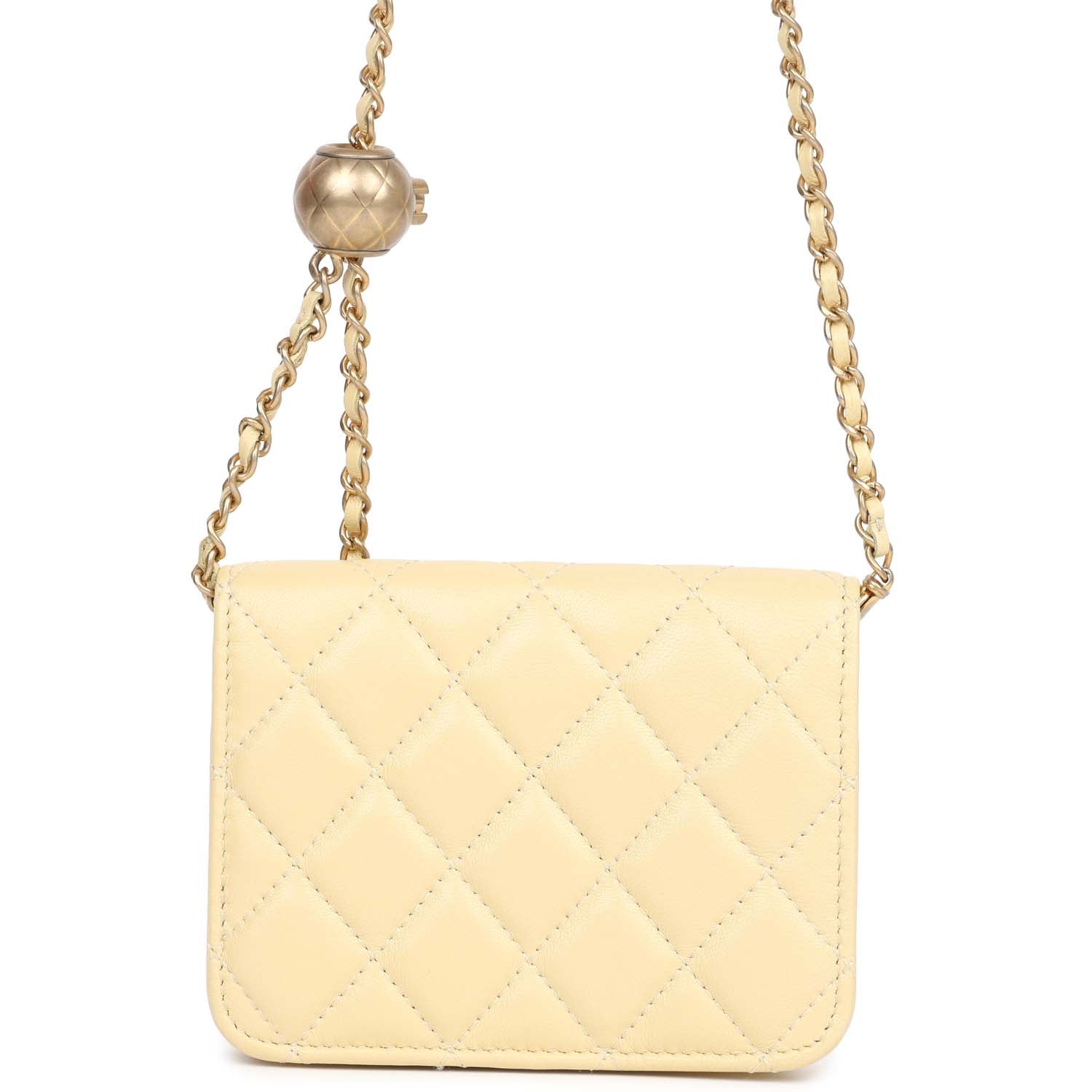 This Chanel Mini Pearl Crush Belt Bag is in light yellow lambskin leather with antique gold hardware, featuring signature quilt leather, signature CC logo on front, CC snap closure and an adjustable interwoven antique gold tone chain link with light yellow leather belt bag strap with quilted CC "ball" crush stopper.
