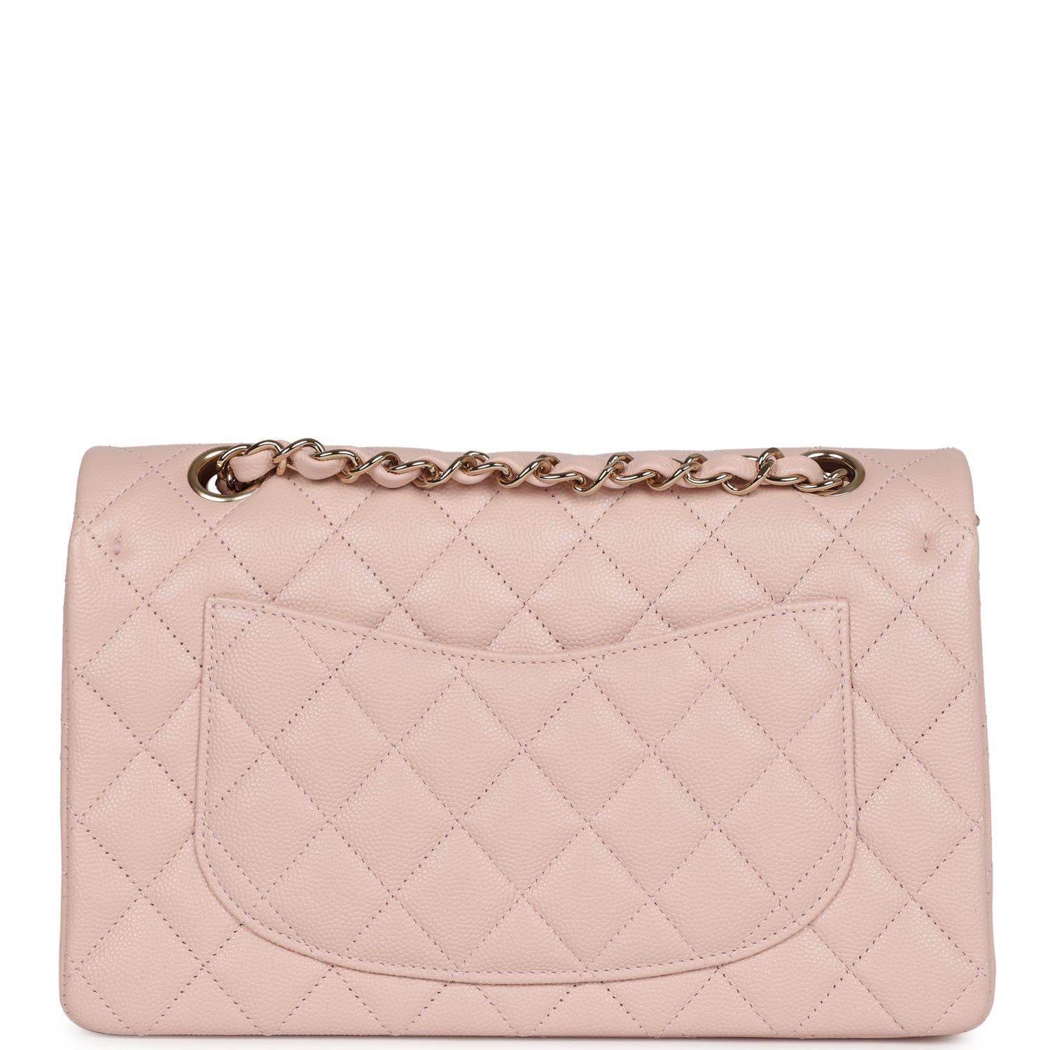 This Small Classic Flap Bag is in light pink caviar leather with gold hardware and features a front flap with CC turnlock closure, halfmoon back pocket and adjustable interwoven gold tone chain link and light pink leather shoulder/crossbody strap.