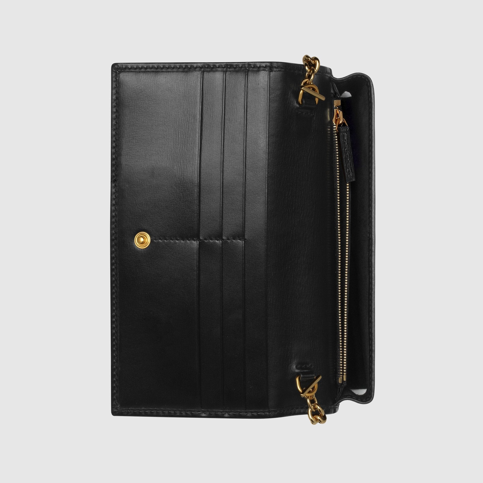 The chain wallet in black leather is introduced as part of the Gucci 1955 Horsebit accessories collection, defined by the double ring and bar design also found in Handbags. The folded snap-closure shape features several slots and pockets, completed with a detachable chain strap.
