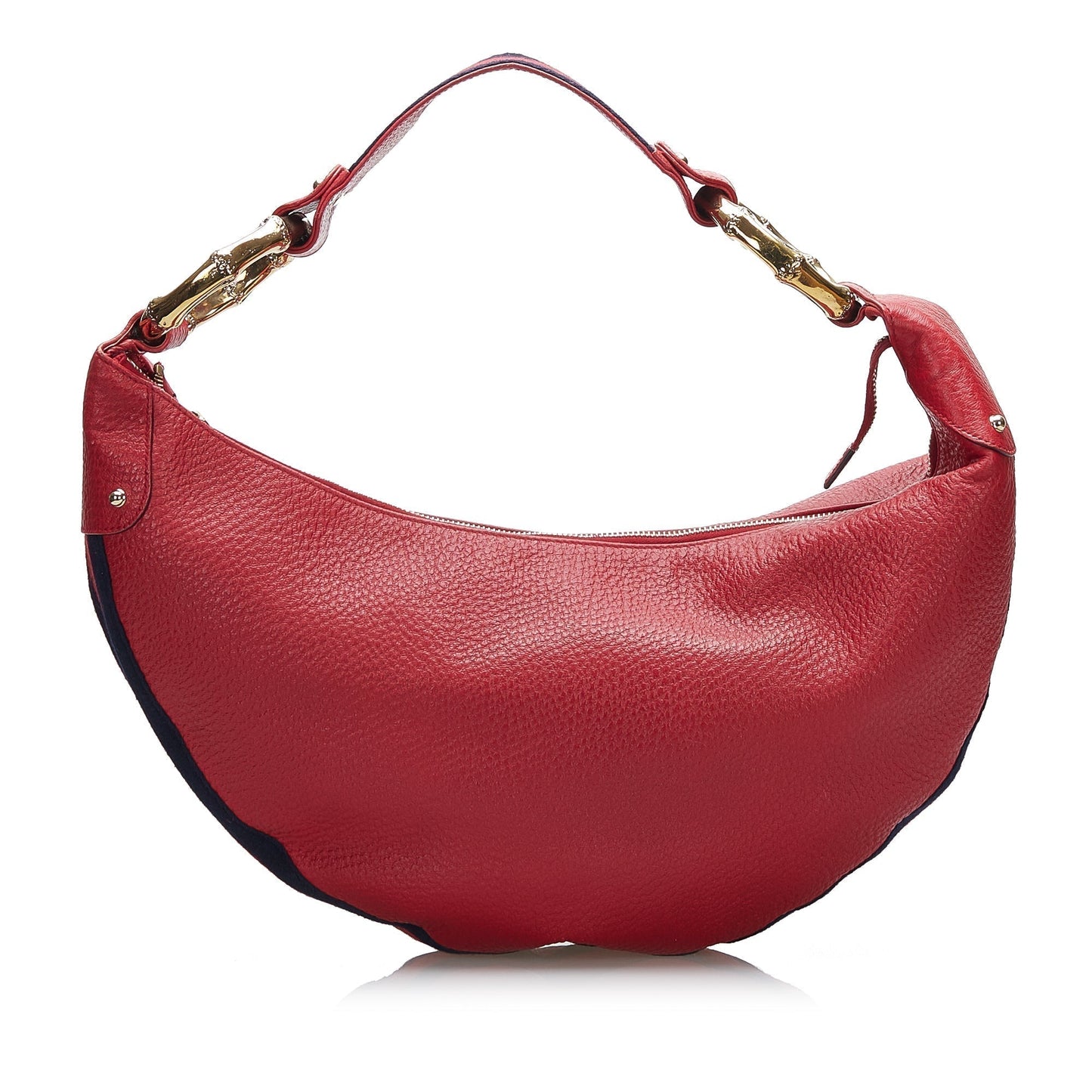 This hobo bag features a leather body, a flat leather strap with a bamboo ring detail, a top zip closure, and an interior zip pocket.