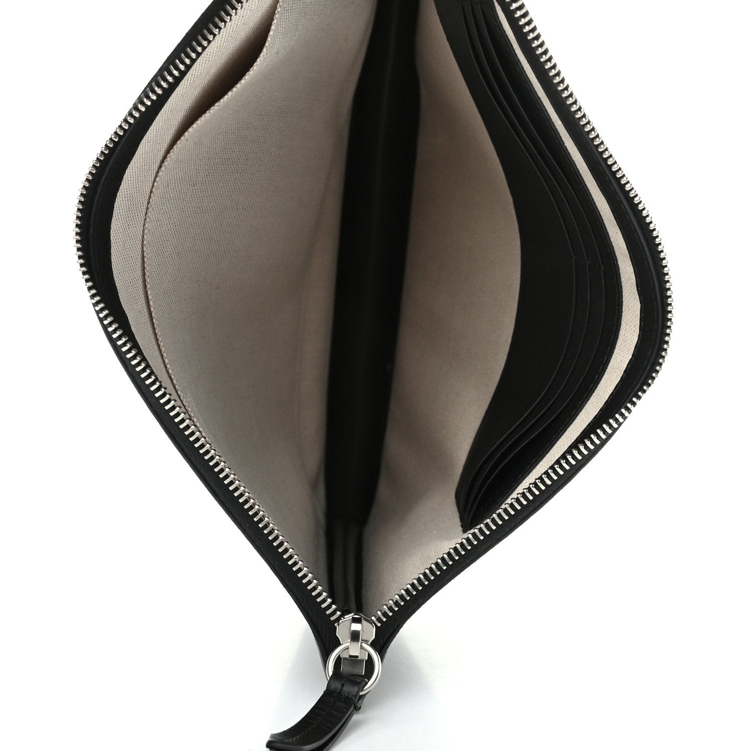 This clutch from Gucci is the perfect accessory to complete any outfit. It is crafted with a tiger printed Guccisima Supreme Canvas and black leather details. There is a detachable wristlet strap and a zipper across the top of the clutch that is accented by all silver toned-hardware. This bag has plenty of room to fit everything you would need and is perfect for a night out!