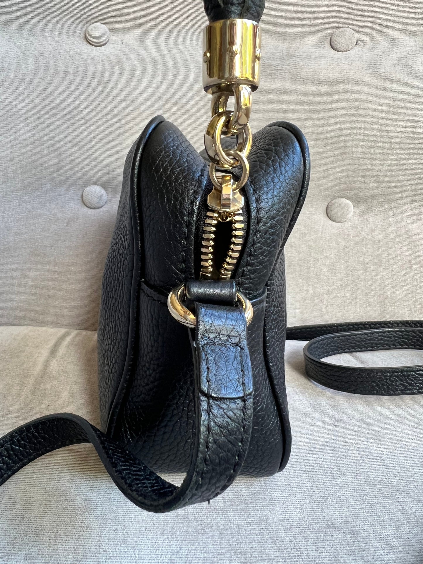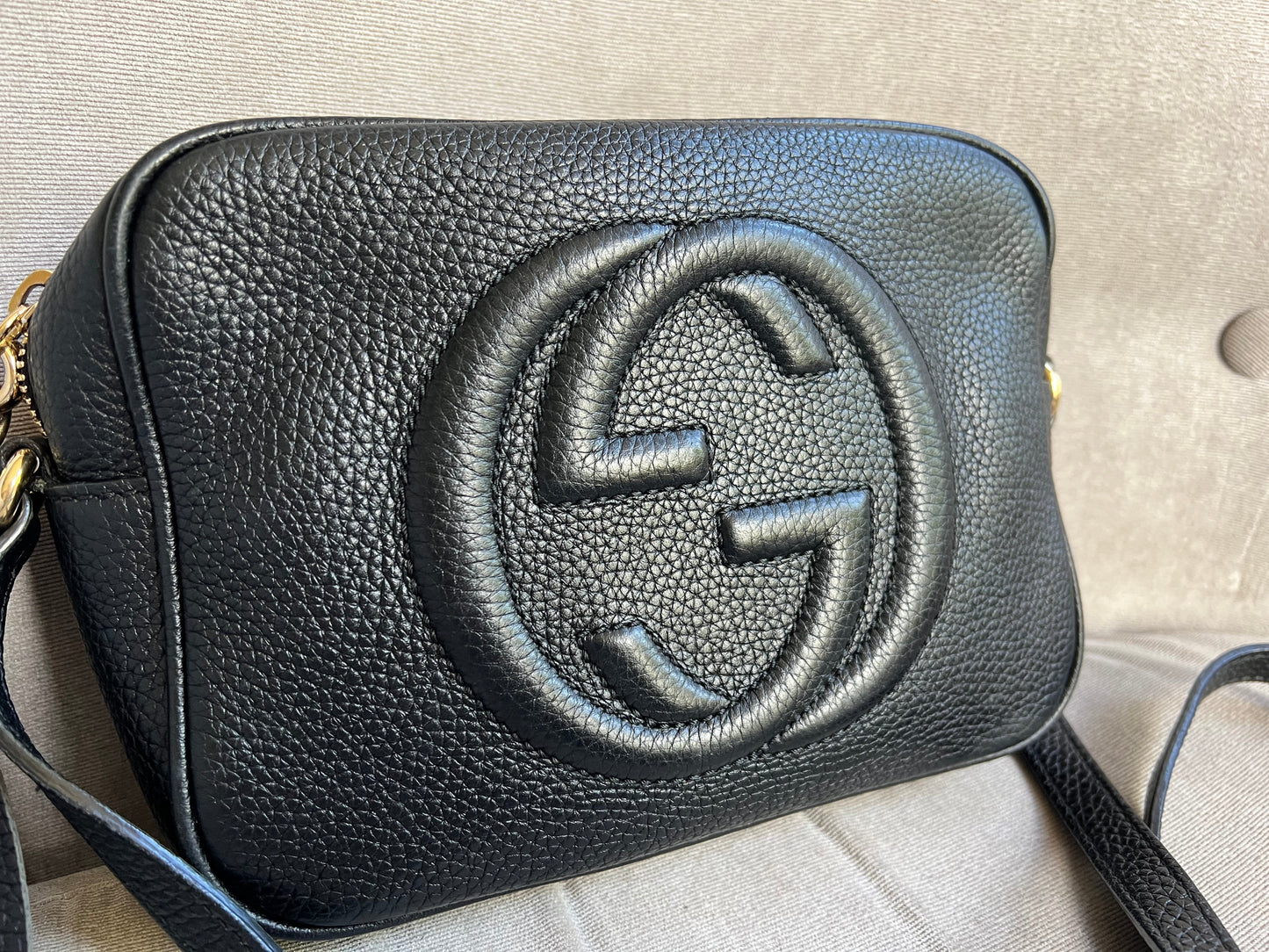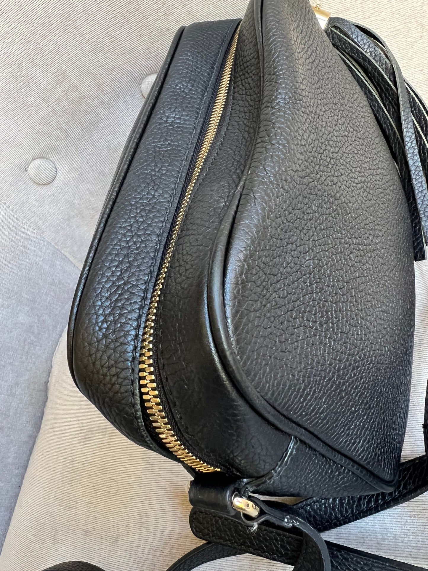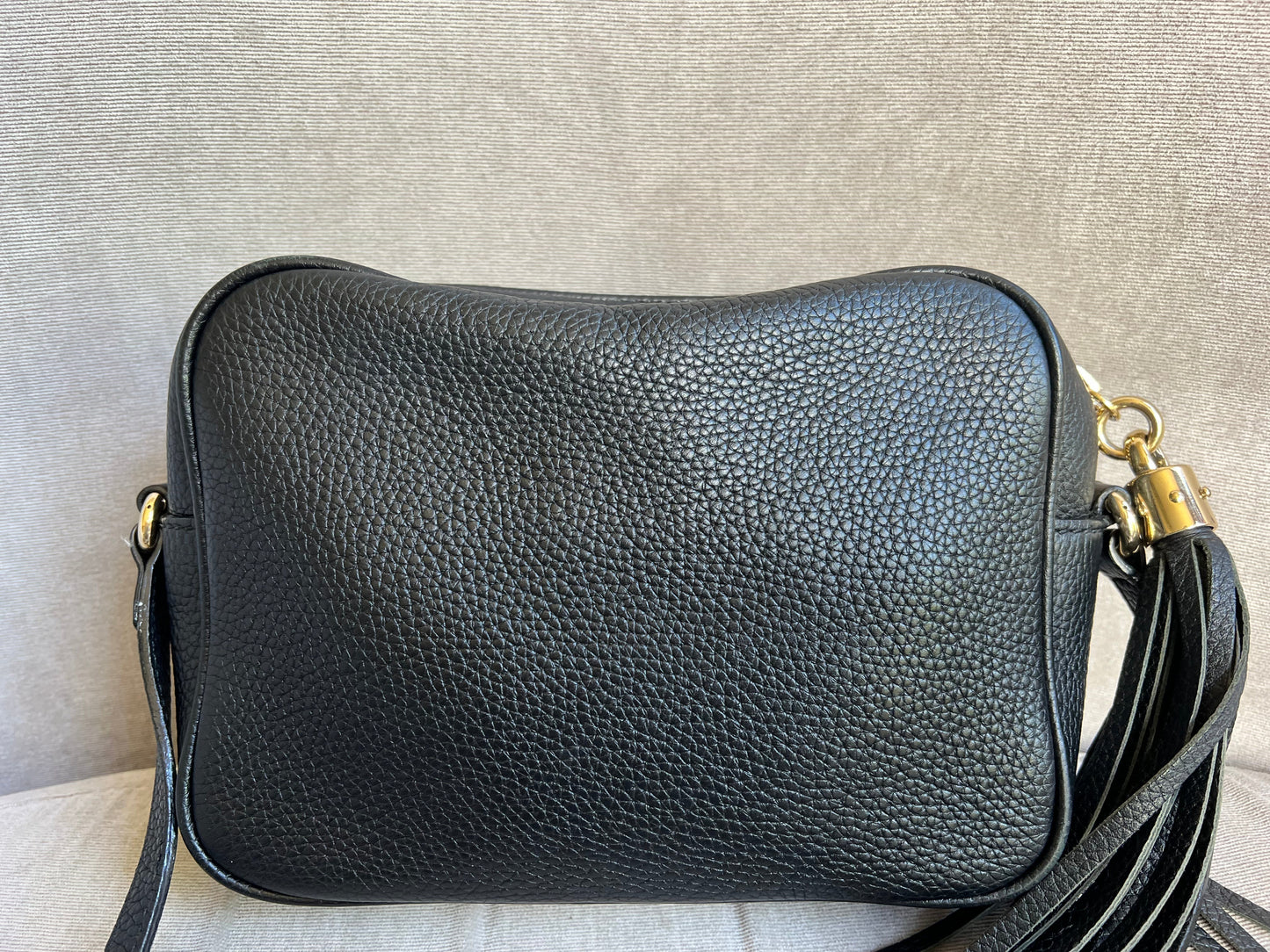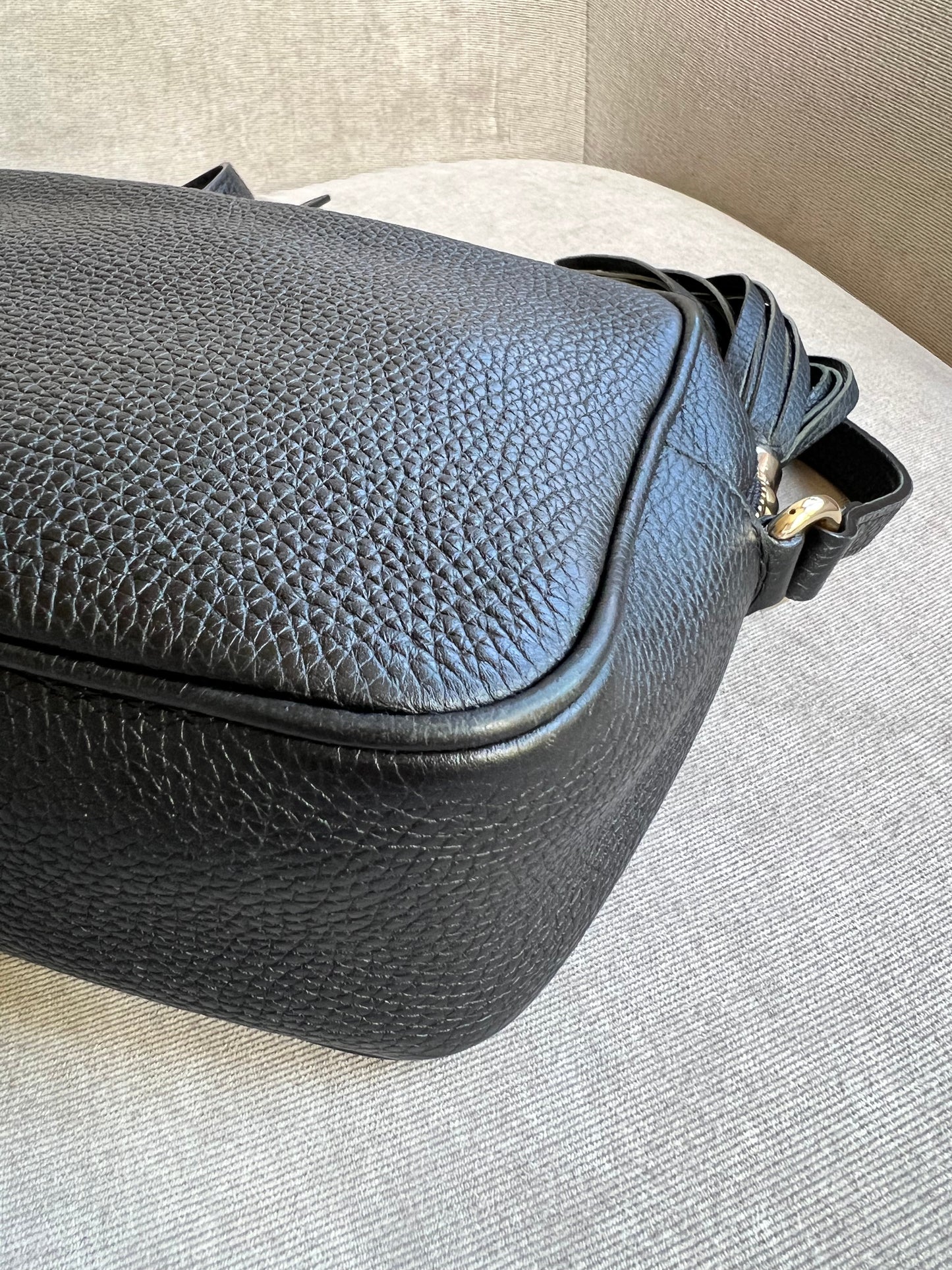 Gucci Soho Disco in Black Leather with pale gold hardware. This practical, cross body, camera style bag is compact in size but still fits a reasonable amount. Can be over shoulder or cross body. Gucci's most popular style and goes with any outfit, dressed up or down.