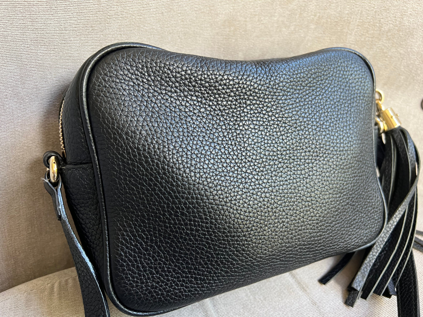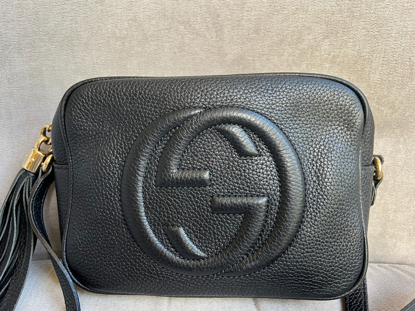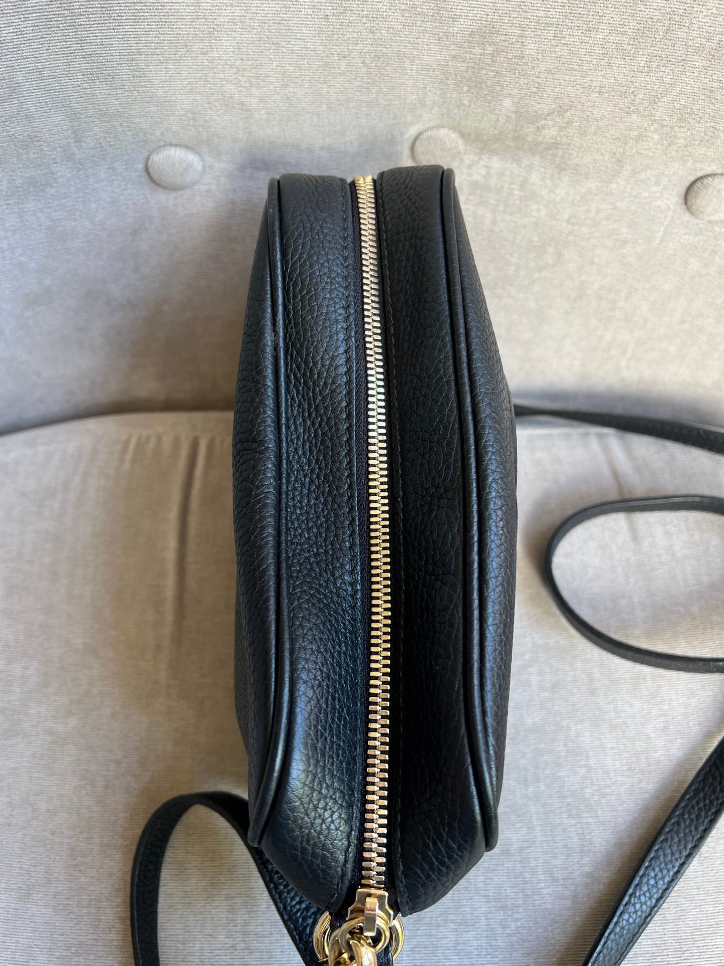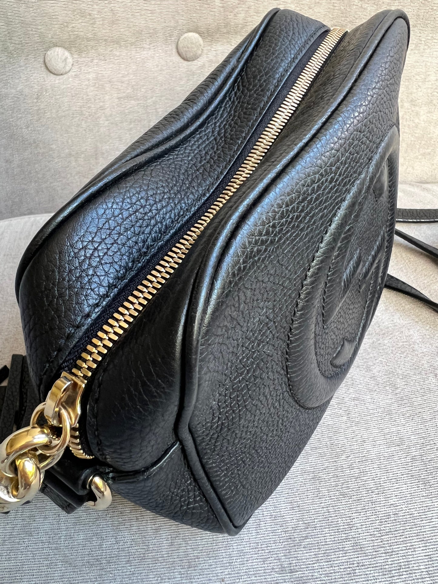 Gucci Soho Disco in Black Leather with pale gold hardware. This practical, cross body, camera style bag is compact in size but still fits a reasonable amount. Can be over shoulder or cross body. Gucci's most popular style and goes with any outfit, dressed up or down.