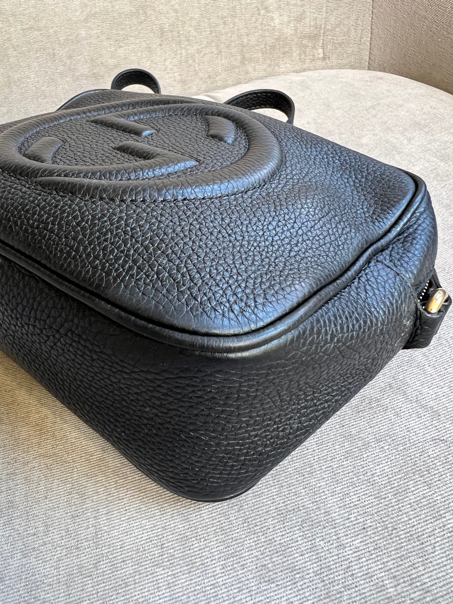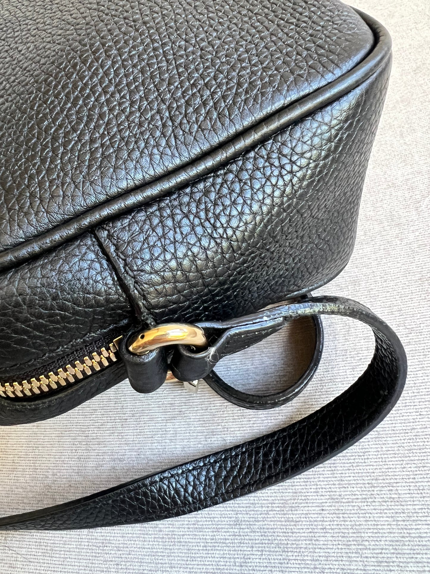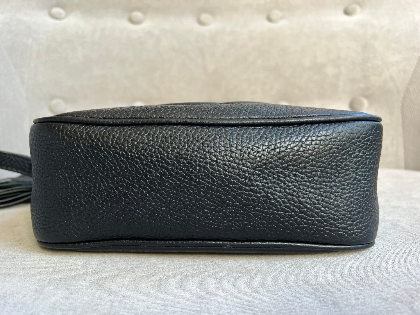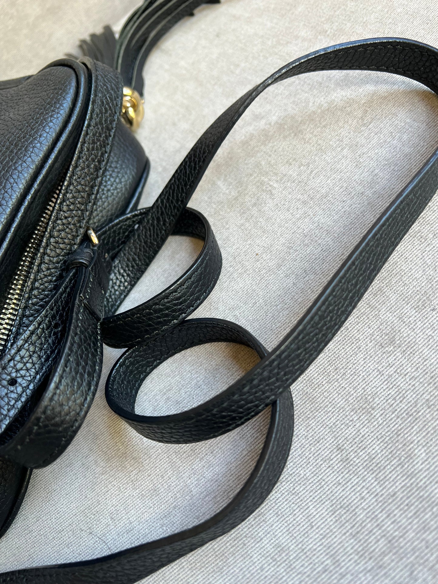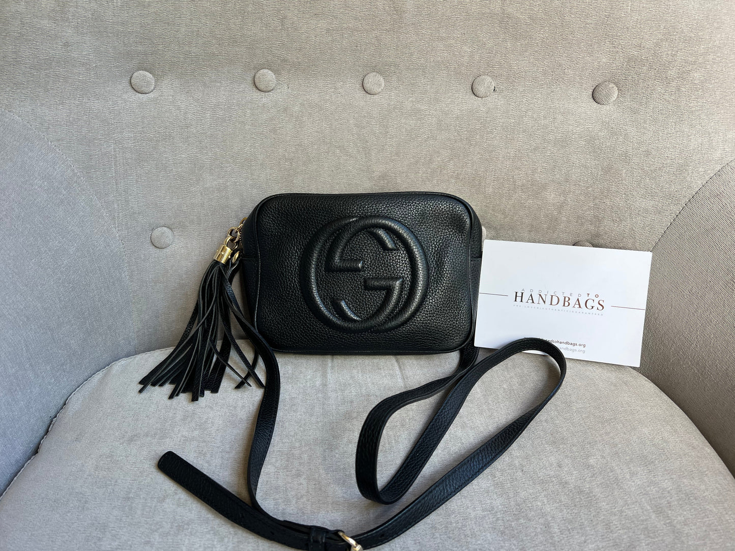 Gucci Soho Disco in Black Leather with pale gold hardware. This practical, cross body, camera style bag is compact in size but still fits a reasonable amount. Can be over shoulder or cross body. Gucci's most popular style and goes with any outfit, dressed up or down.