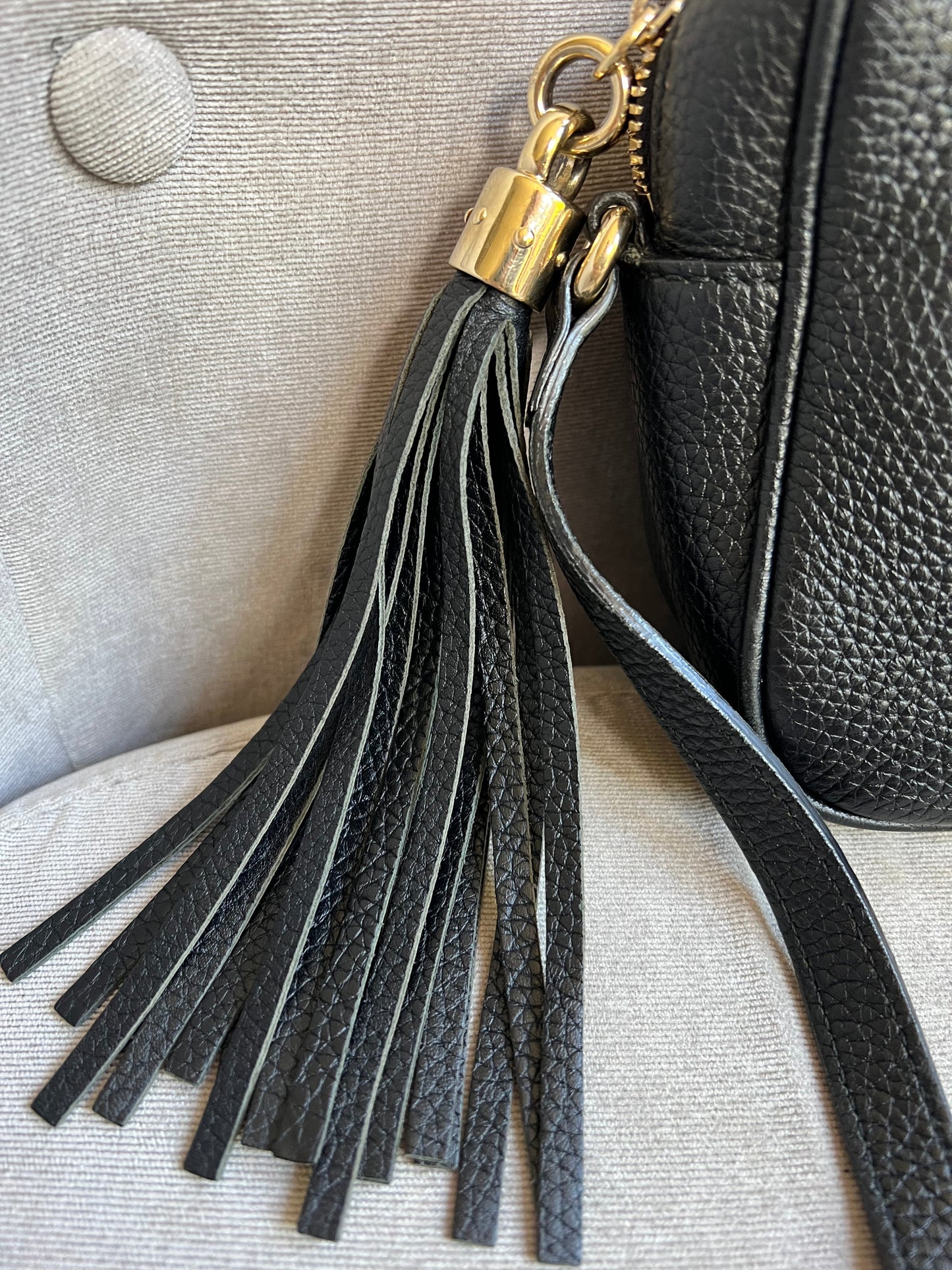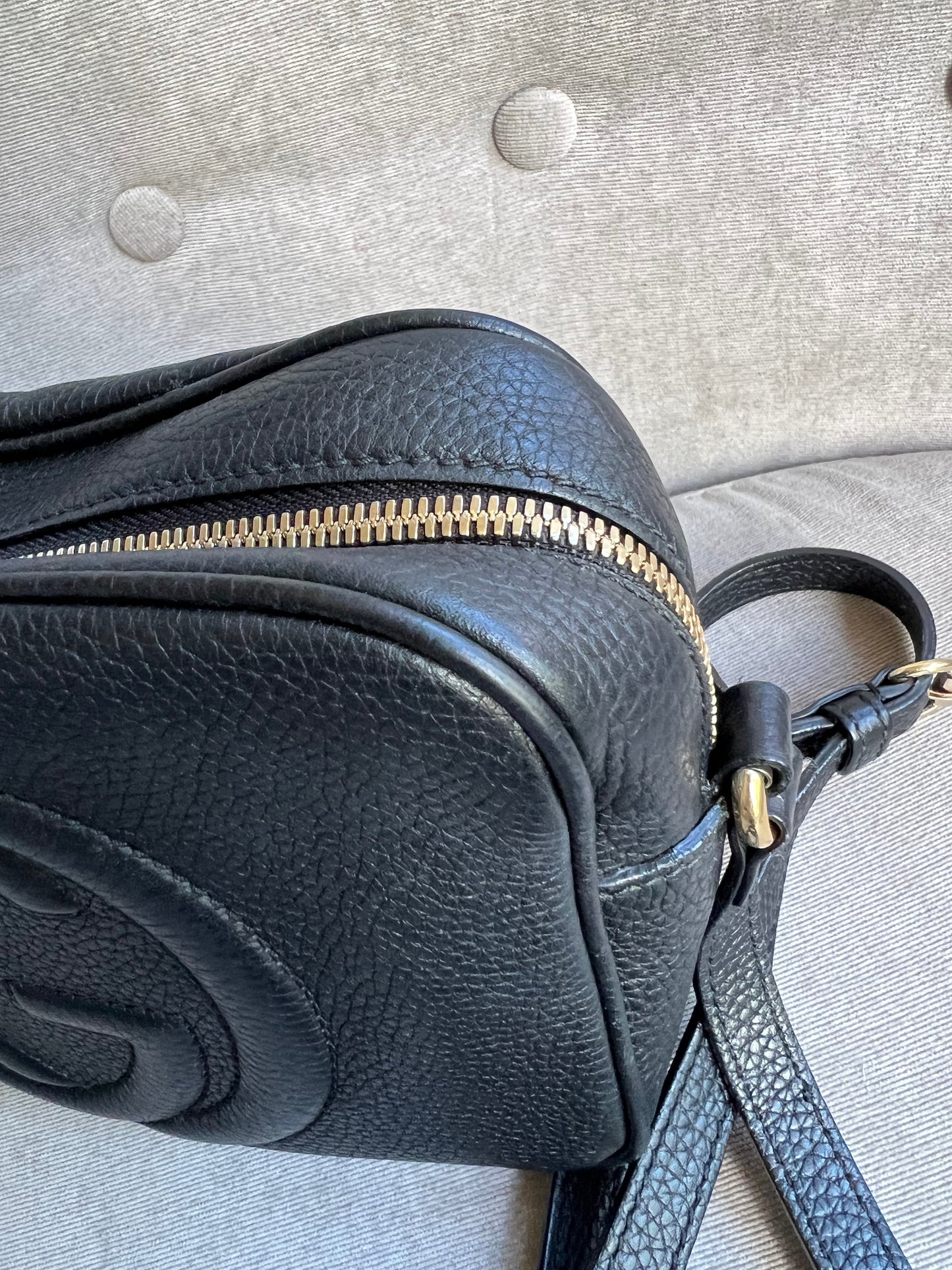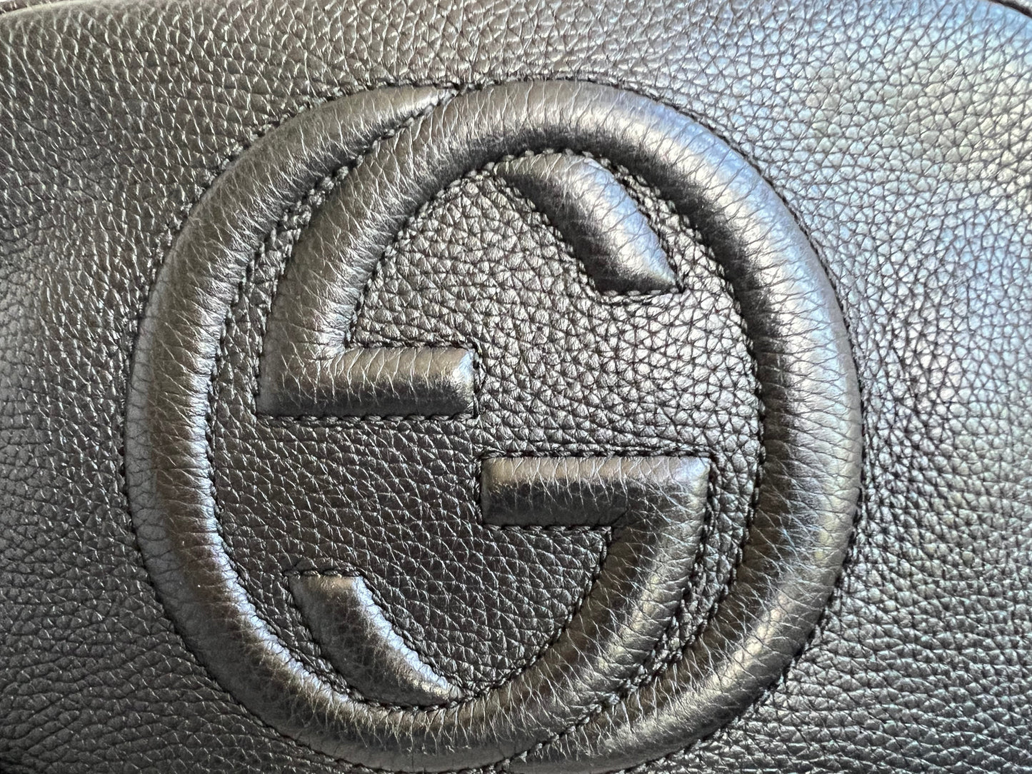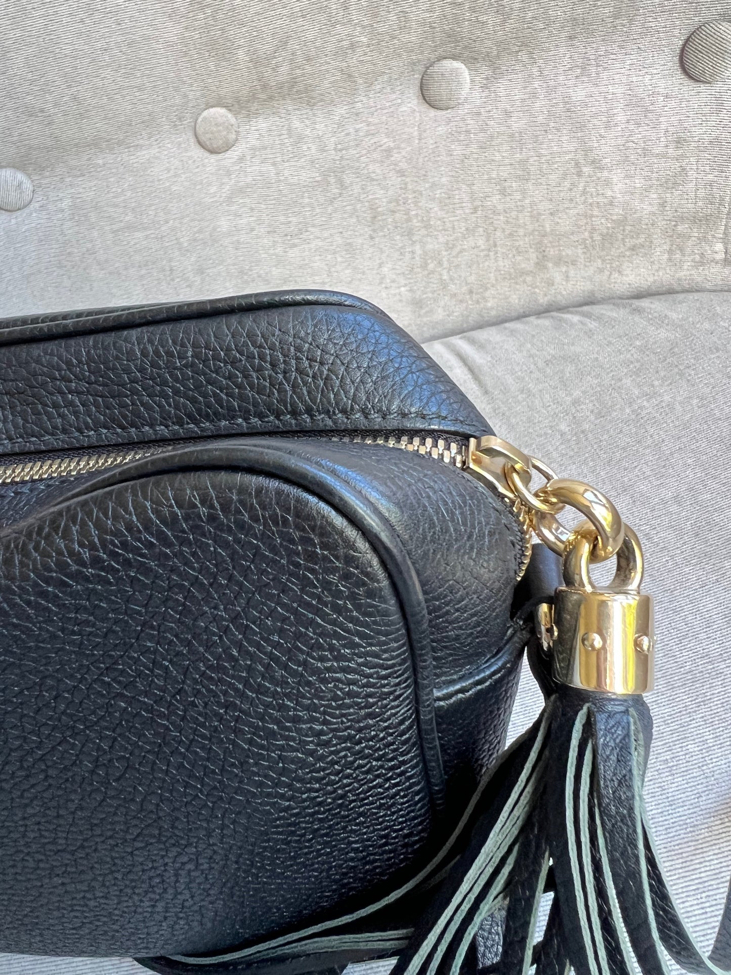 Gucci Soho Disco in Black Leather with pale gold hardware. This practical, cross body, camera style bag is compact in size but still fits a reasonable amount. Can be over shoulder or cross body. Gucci's most popular style and goes with any outfit, dressed up or down.