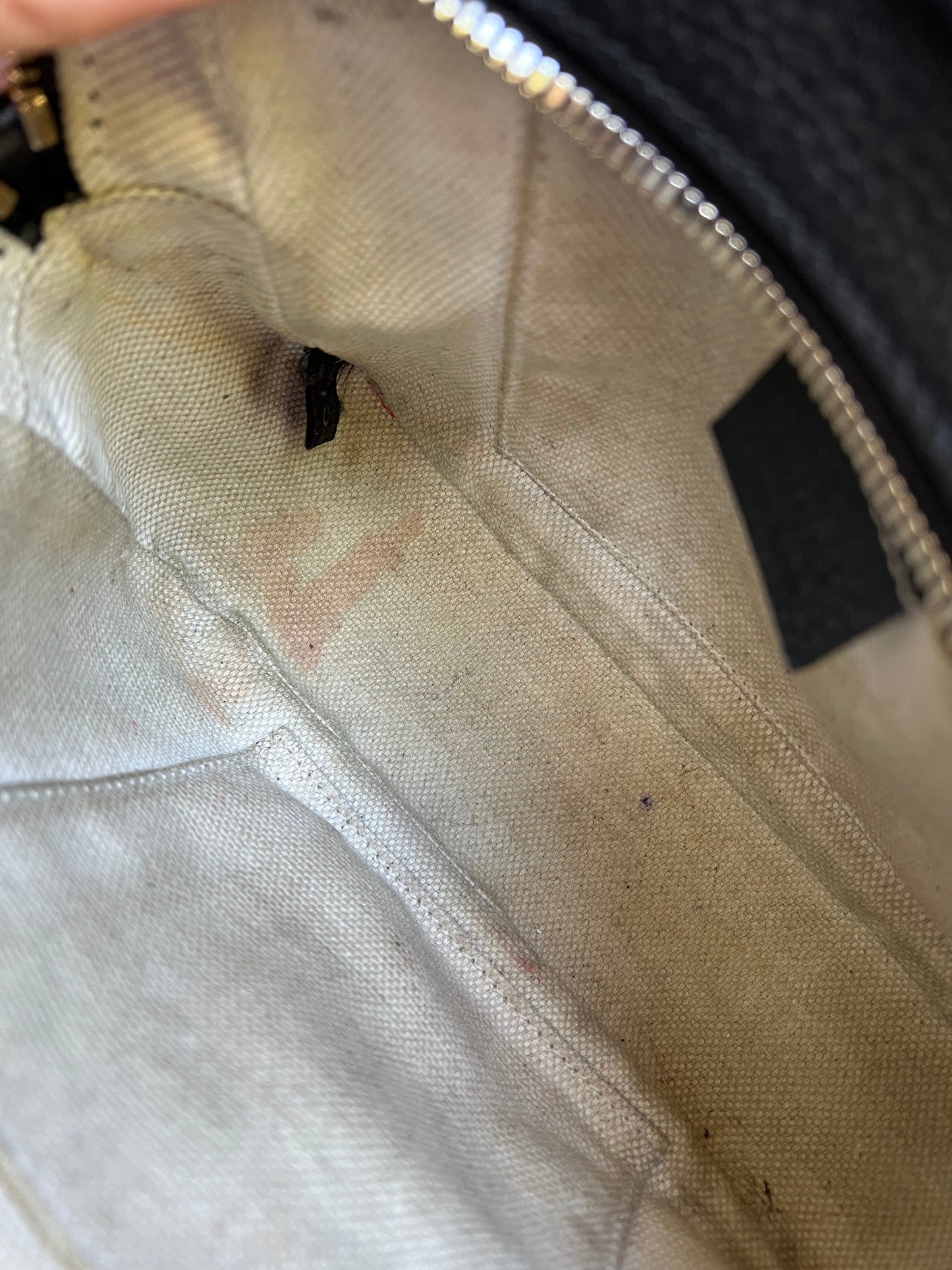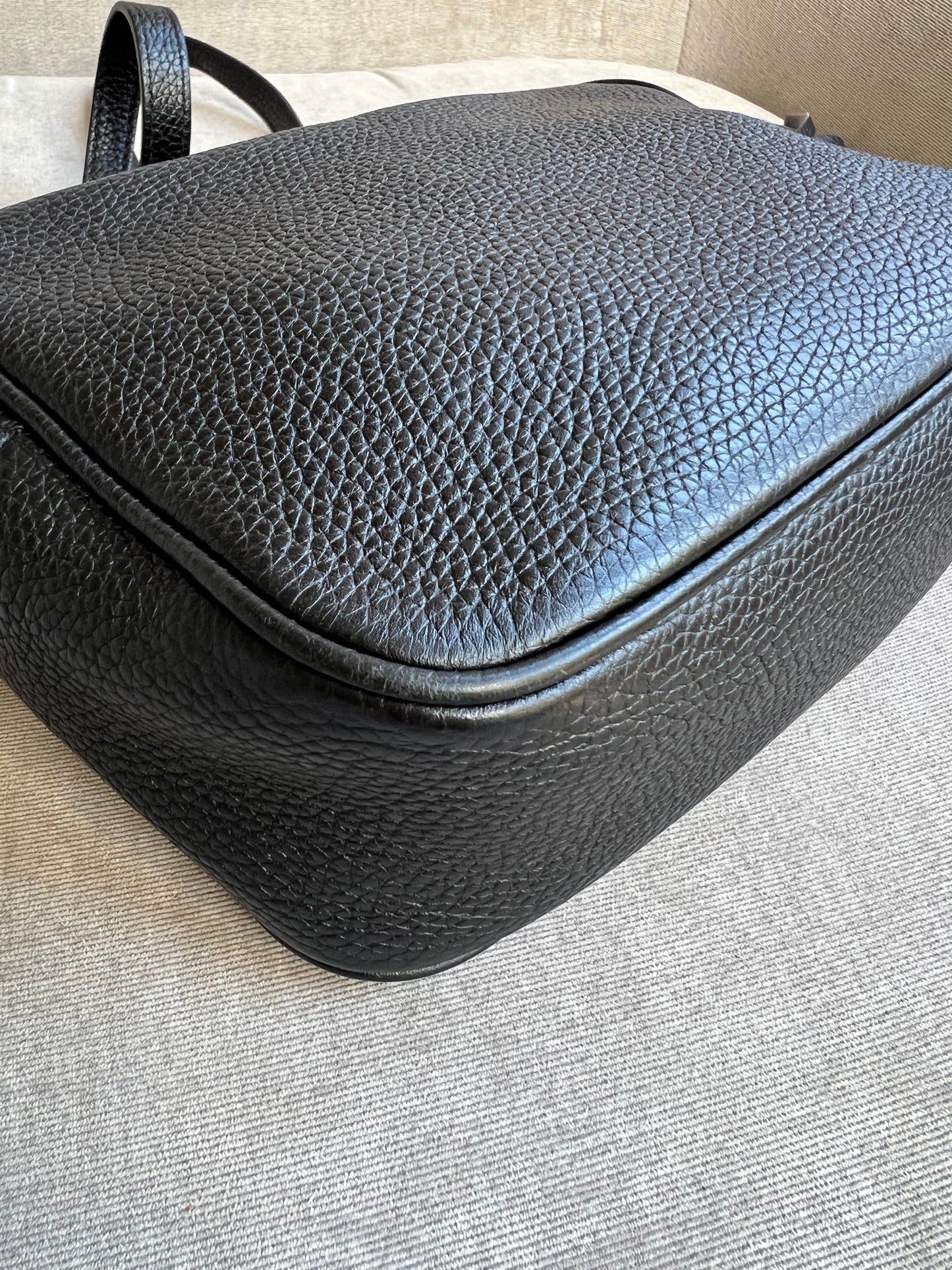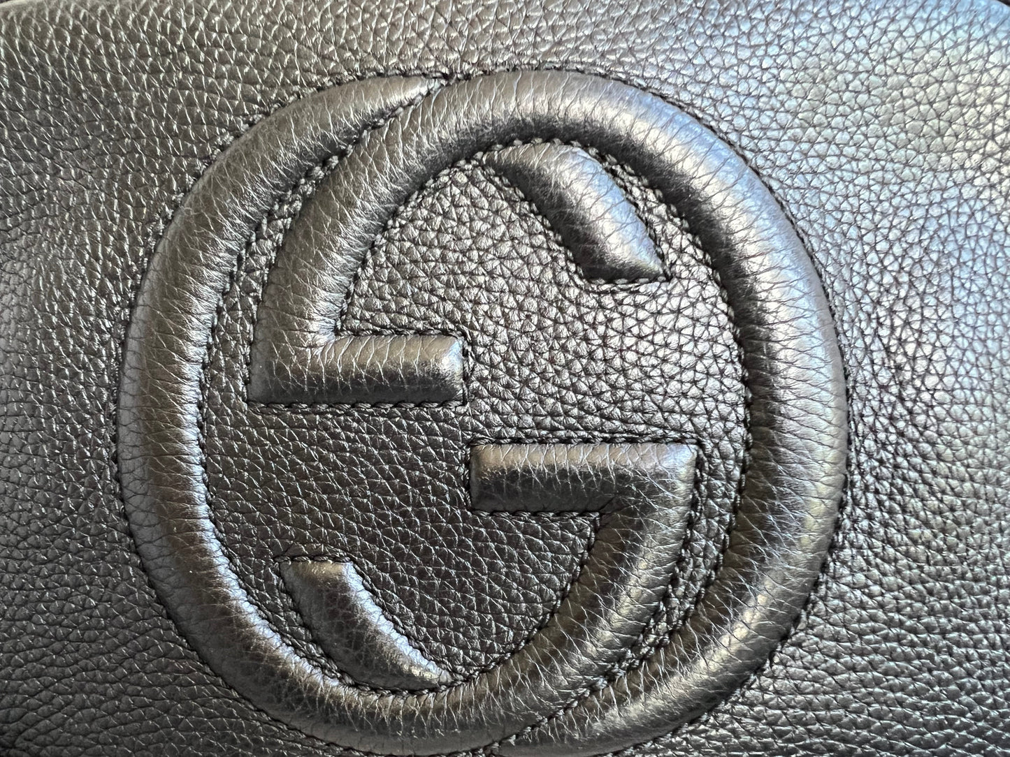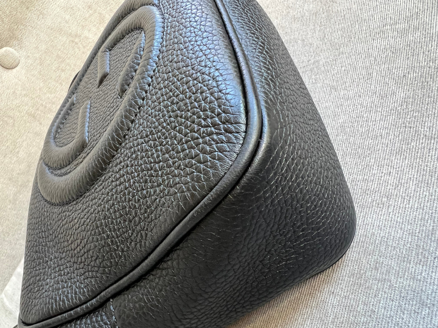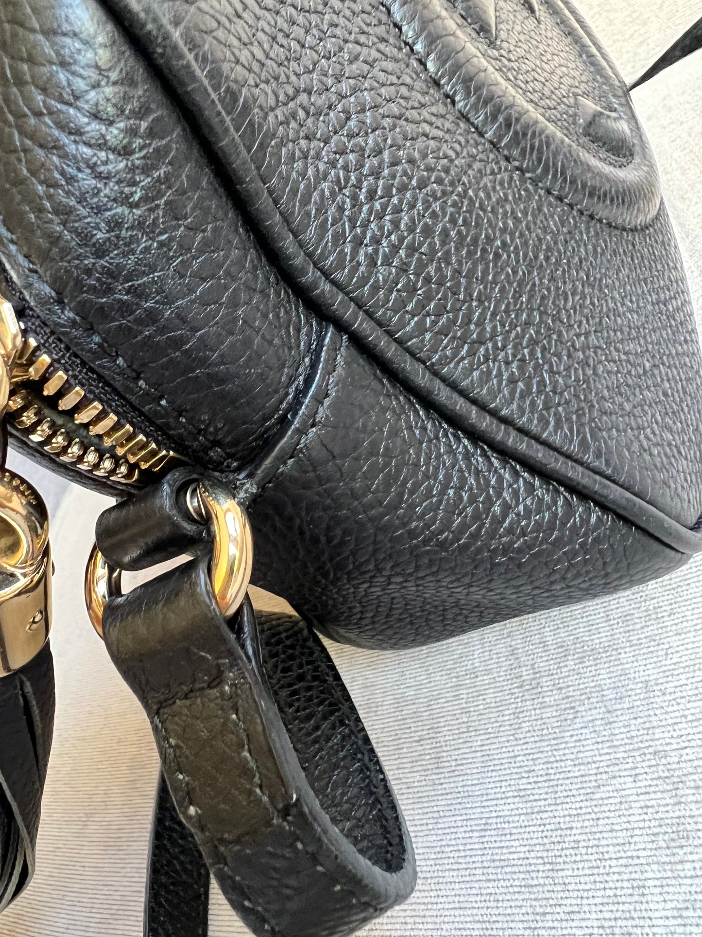 Gucci Soho Disco in Black Leather with pale gold hardware. This practical, cross body, camera style bag is compact in size but still fits a reasonable amount. Can be over shoulder or cross body. Gucci's most popular style and goes with any outfit, dressed up or down.
