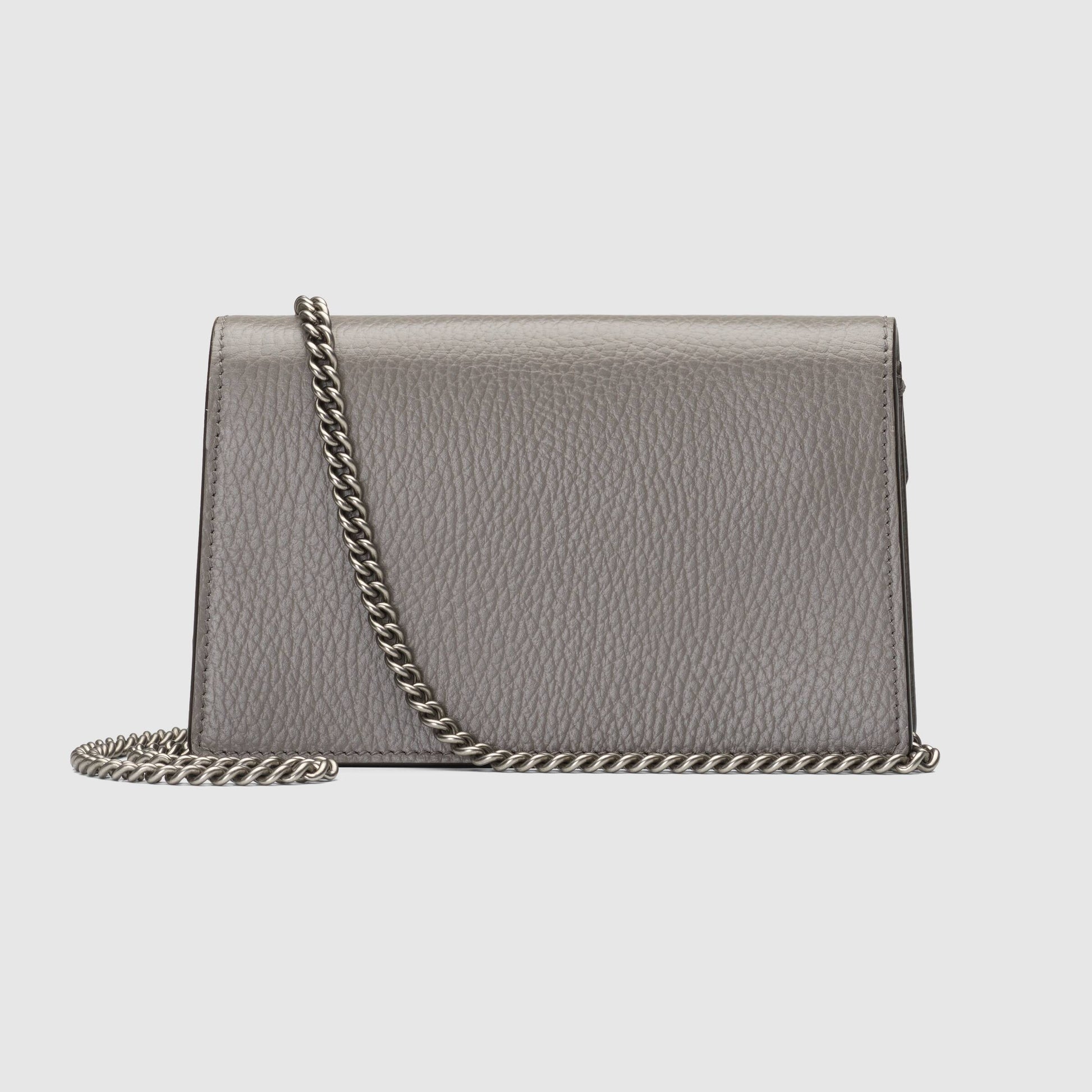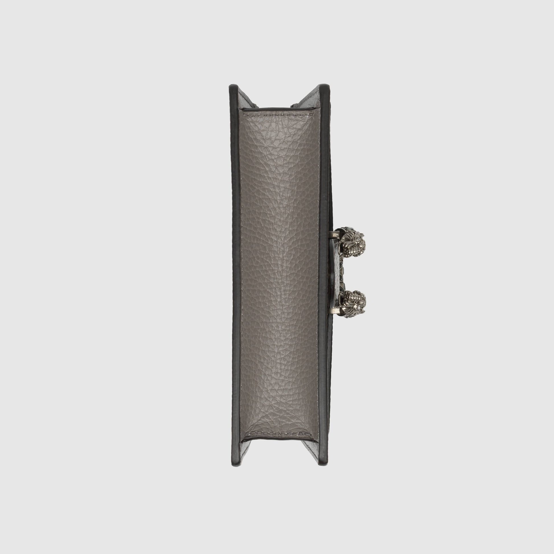 The structured super mini bag is introduced in dusty grey leather for Cruise 2020, with a key ring that can be new to attach this bag to a separate larger bag. The closure features the textured tiger head spur—the unique detail defines the line, referencing the Greek god Dionysus, who in myth is said to have crossed the river Tigris on a tiger sent to him by Zeus. The closure is further enriched with sparkling crystal stones.