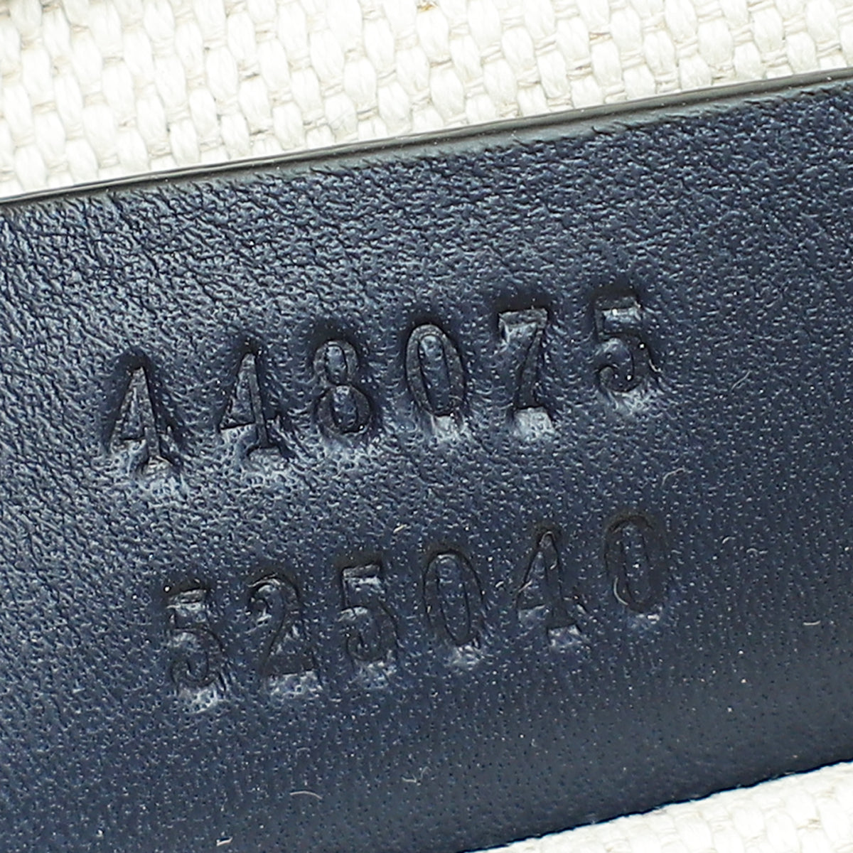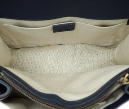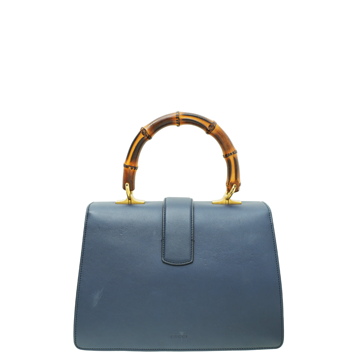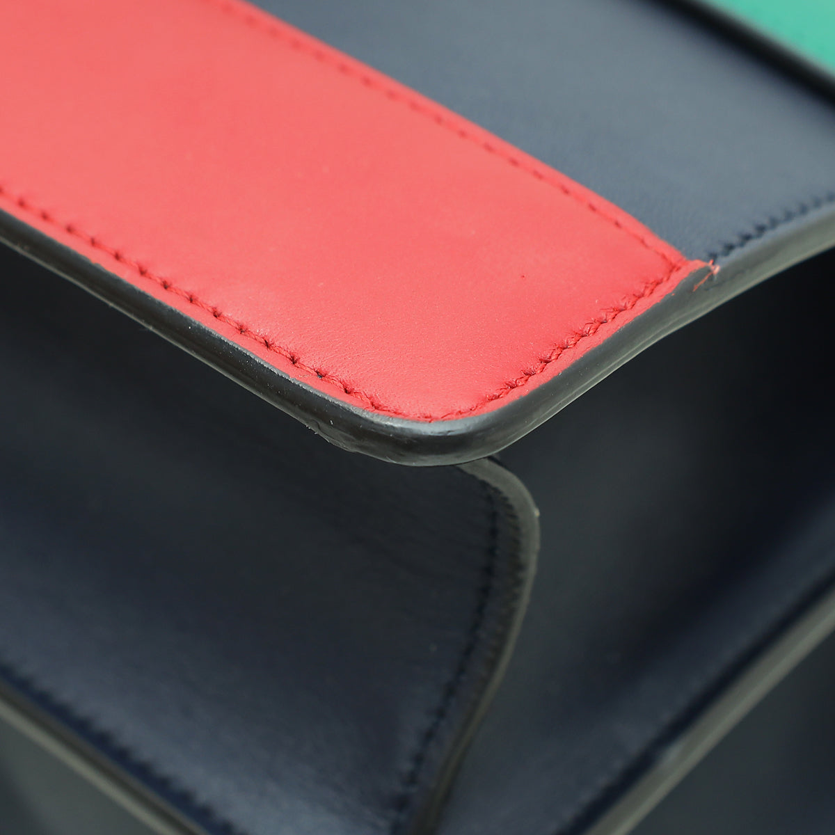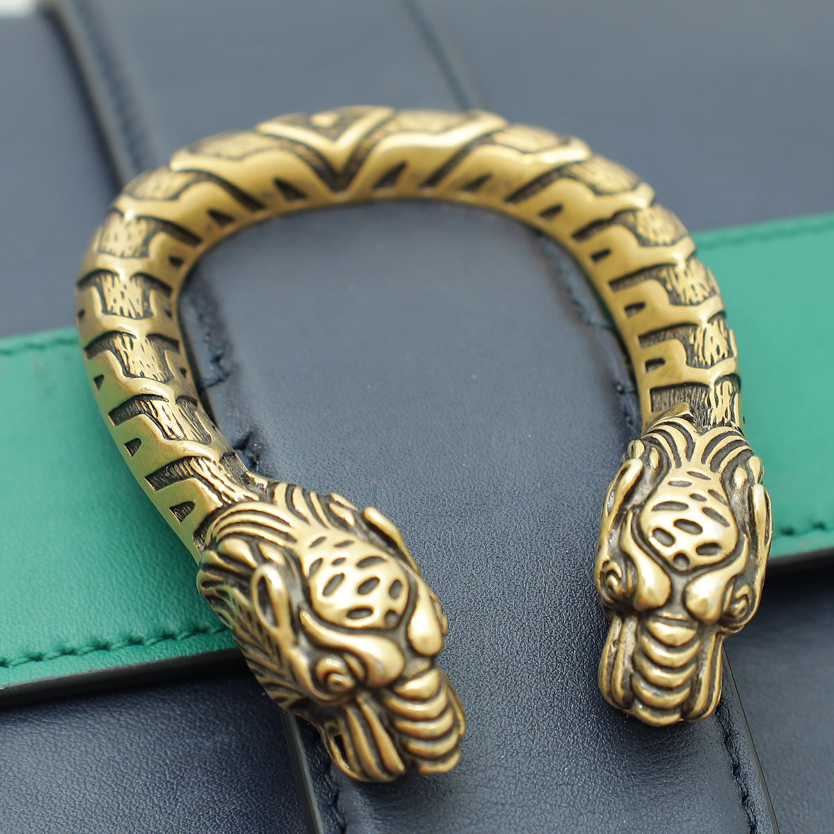 - Material: Navy Blue Smooth Calfskin Leather with Green/Red Striped Leather Trim, Bamboo Handle, Navy Blue/Red Web Strap and Tiger Head Closure