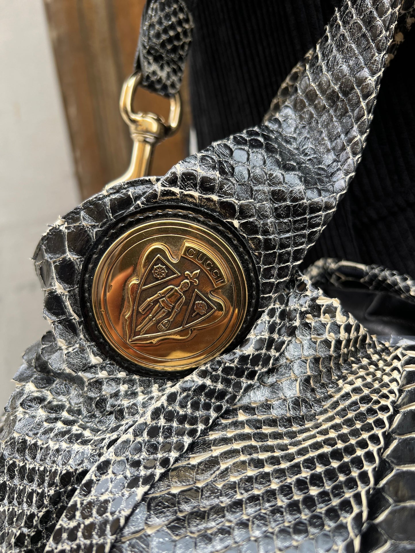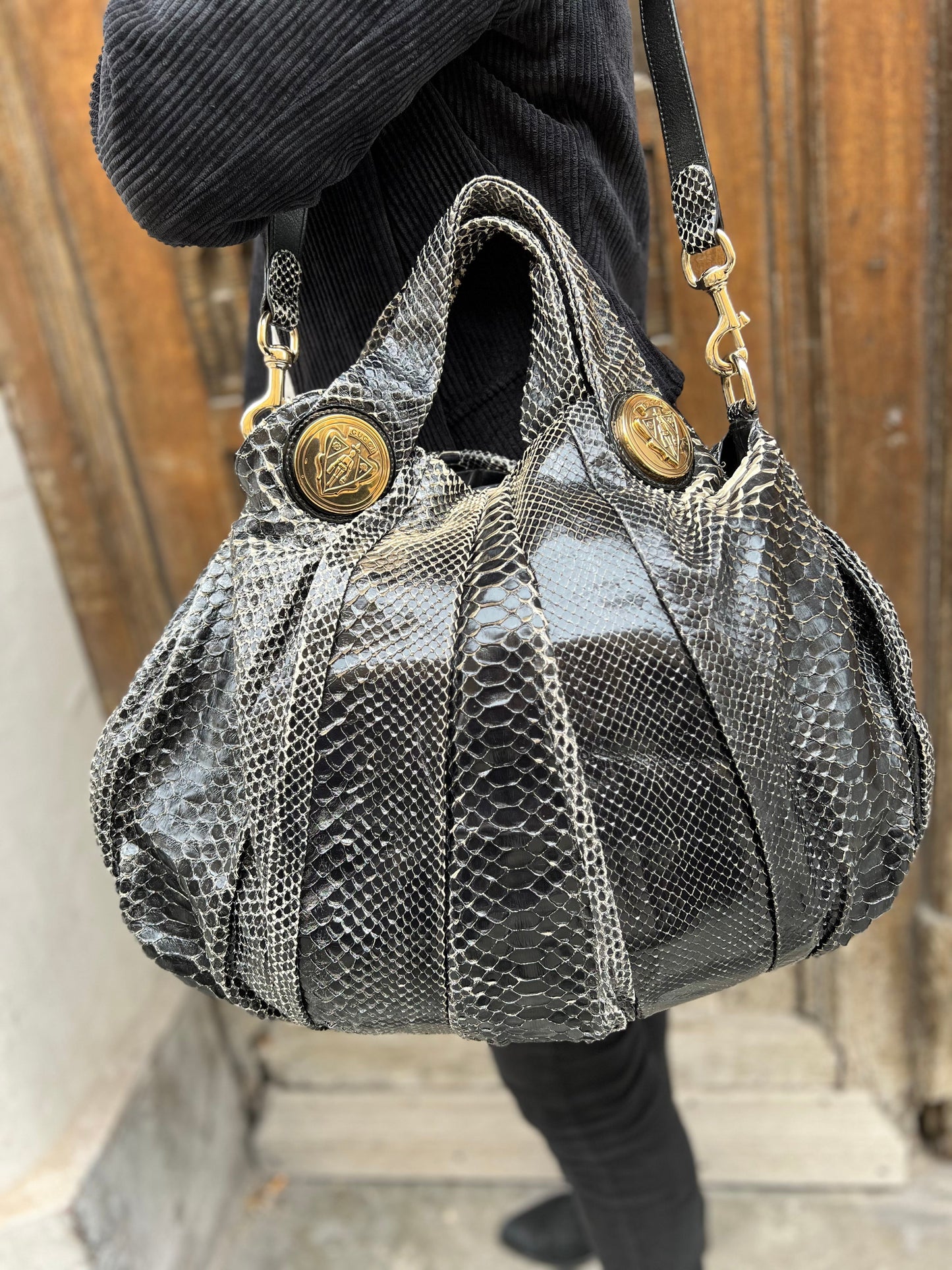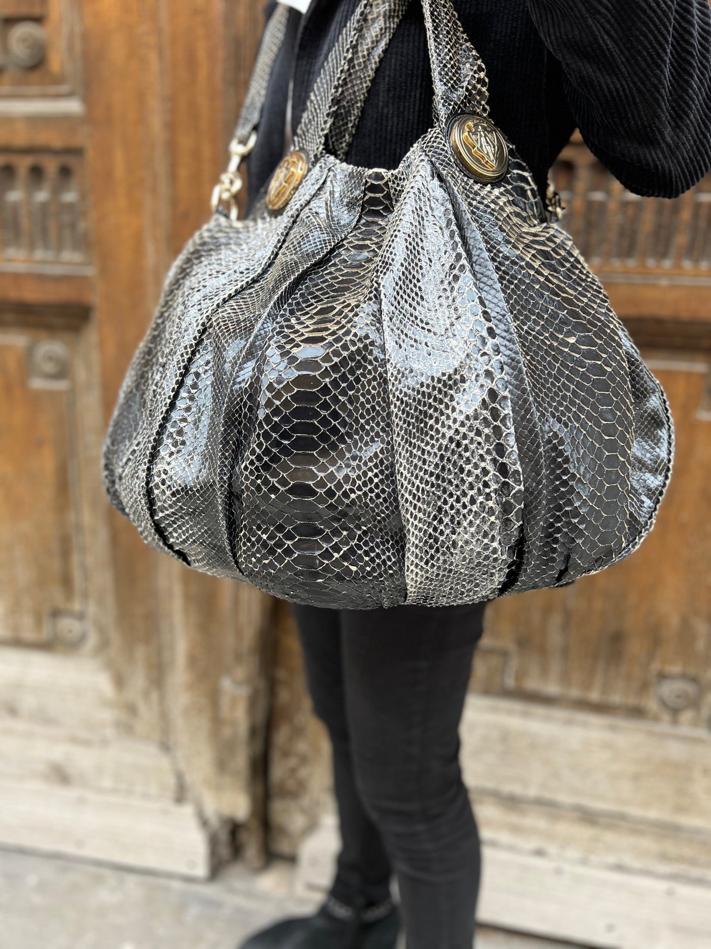 Confectionné en cuir de python véritable, ce sac original arbore l'emblème GG Hysteria. Sa anse amovible lui permet un porté épaule ou mains avec ses deux poignées. Fermeture par bouton pression ; doublure intérieure en tissu siglé noir, une piche zippée et une double pochette plaquée.
