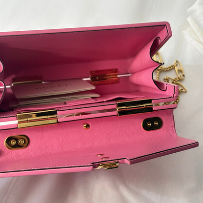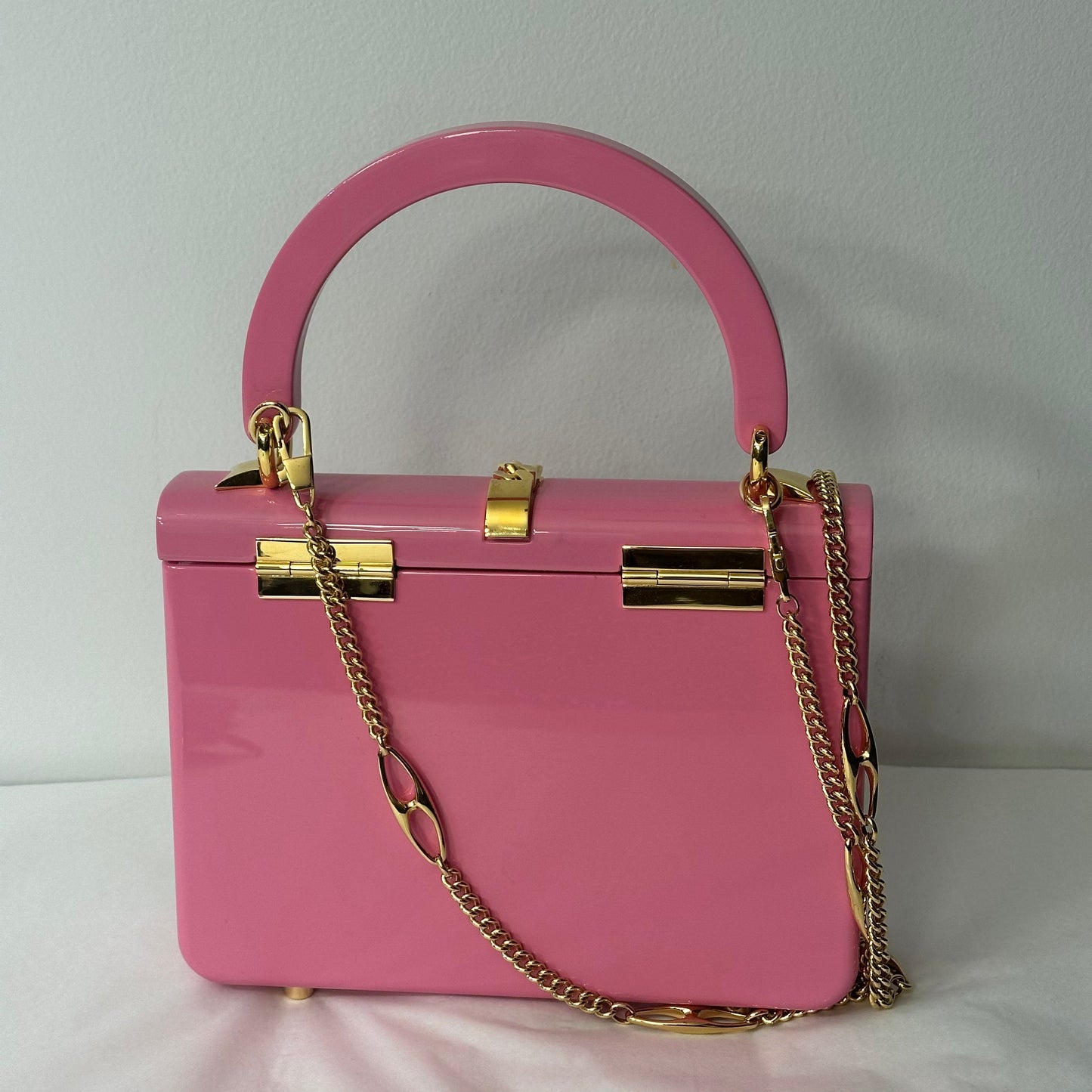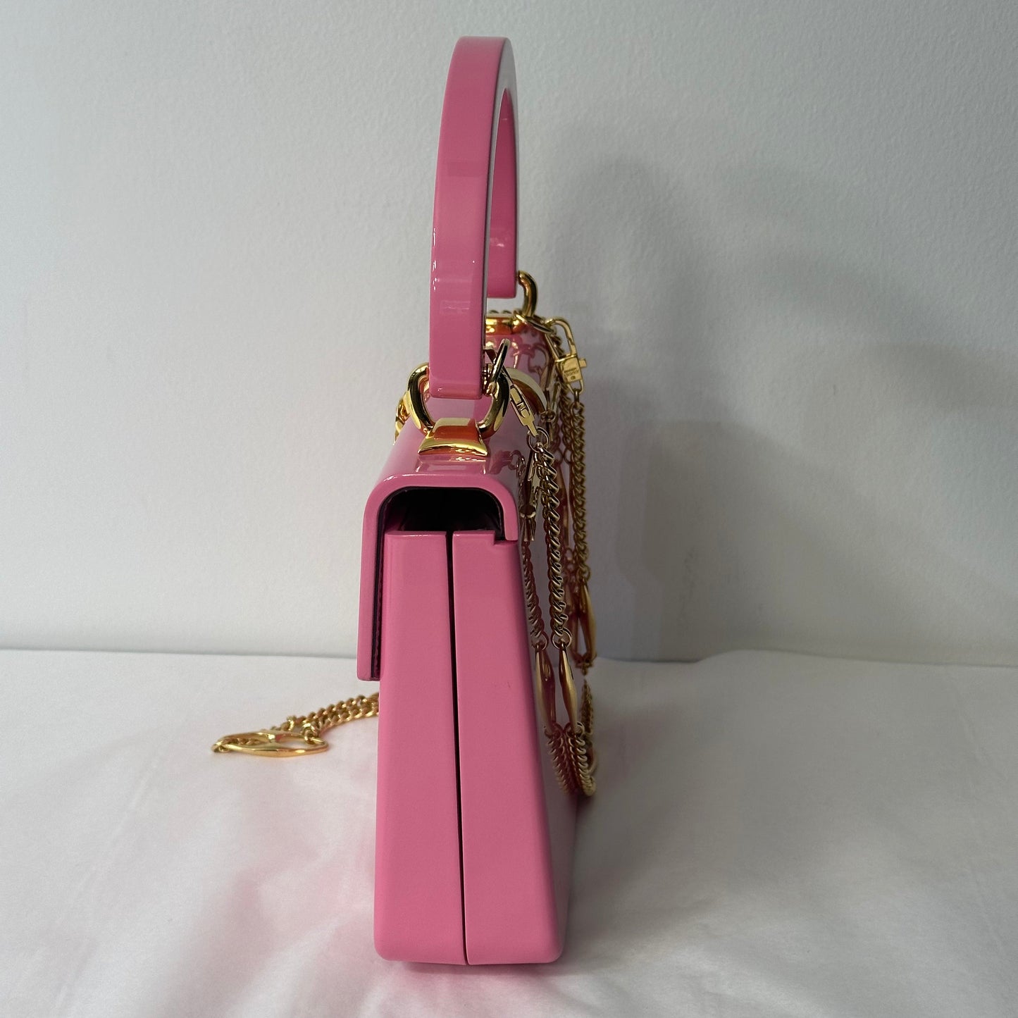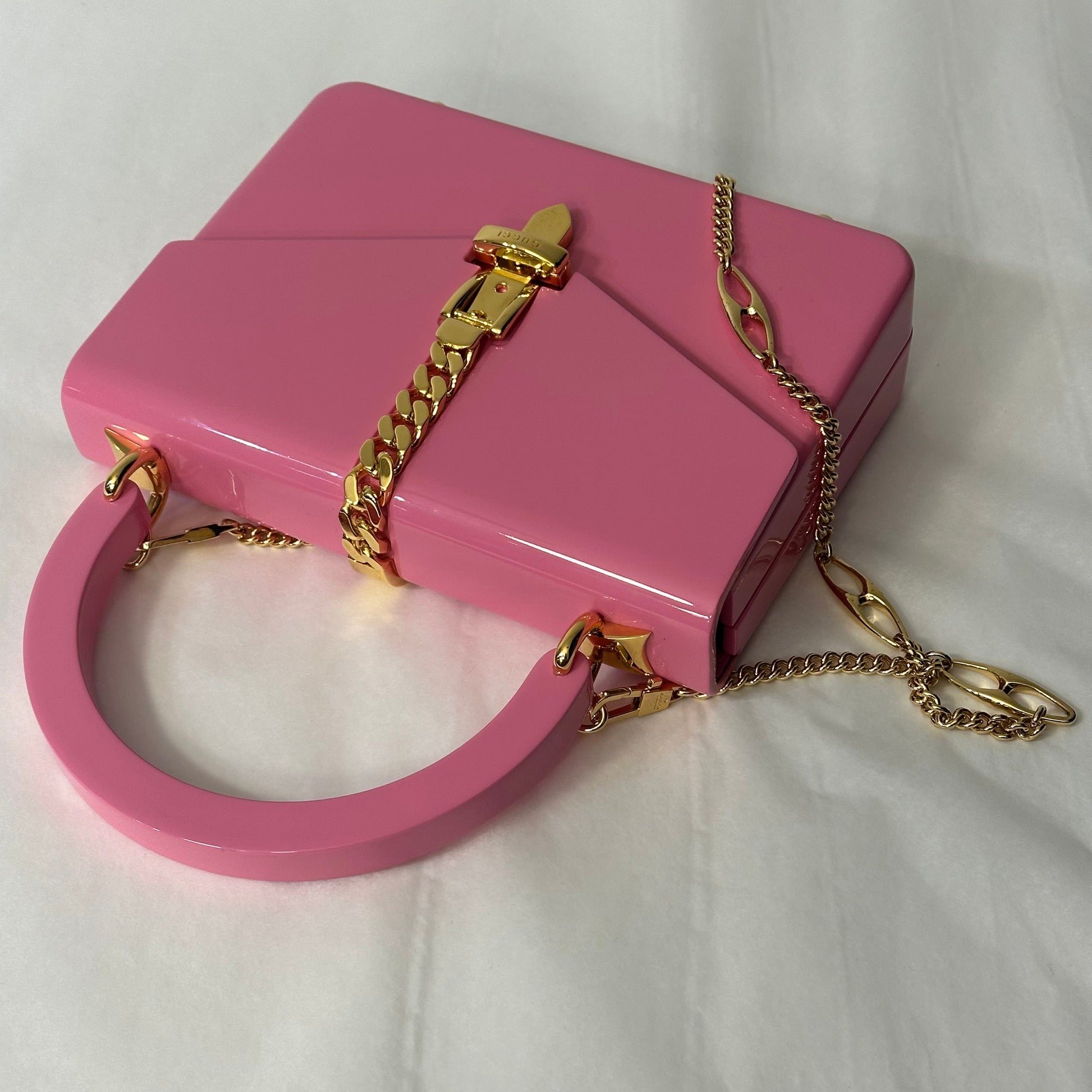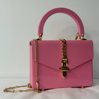 Superbe sac à bandoulière chaîne Gucci mini Sylvie 1969 en plexiglas rose poli.