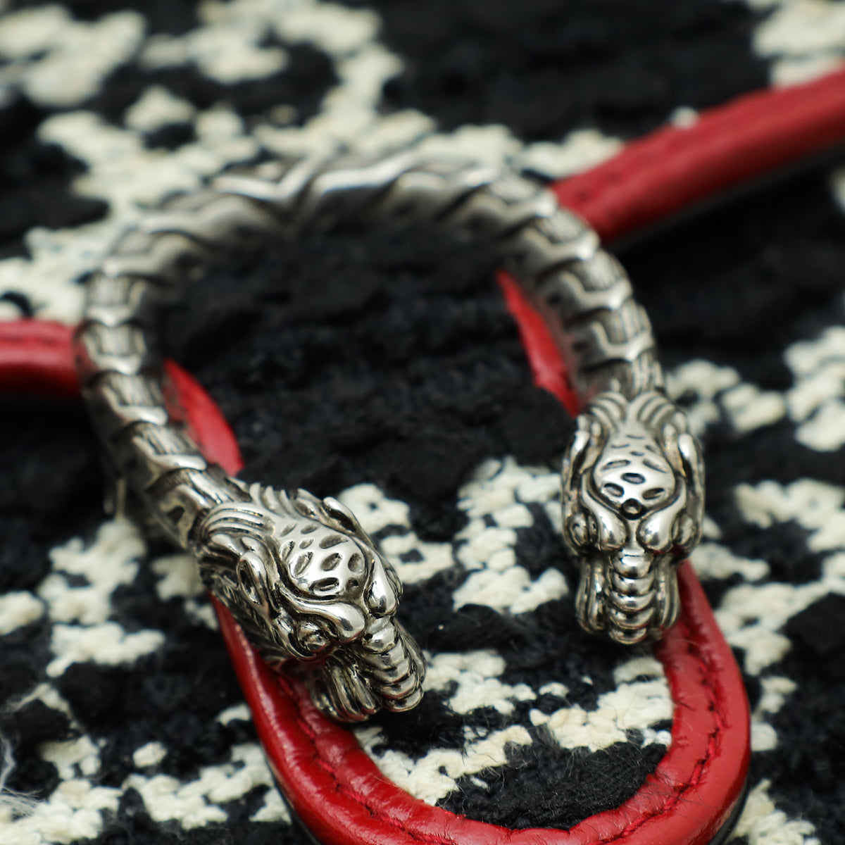 - Material: White/Black Tweed with Dark Red Leather Trim
