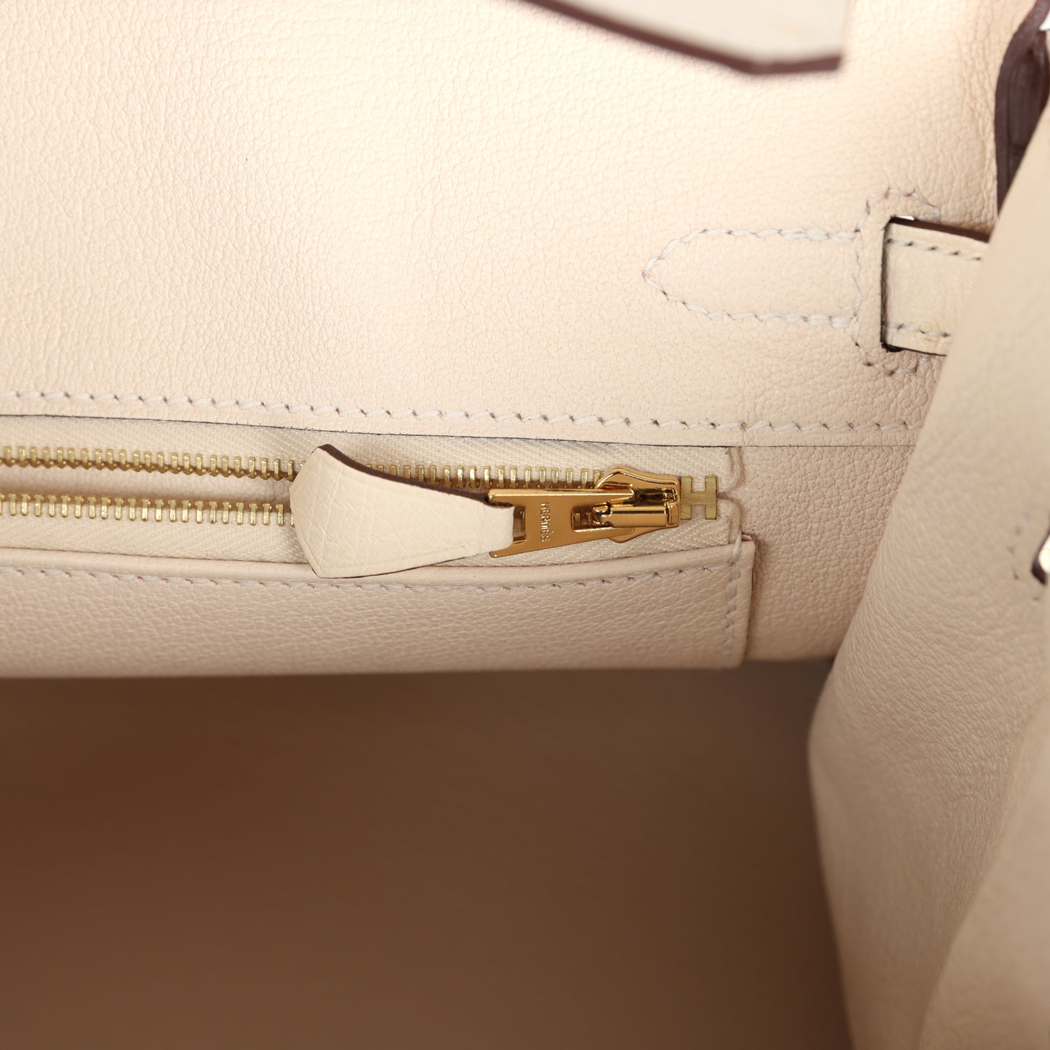 The interior is lined with Nata chevre and has a zip pocket with an Hermes engraved zipper pull and an open pocket on the opposite side.