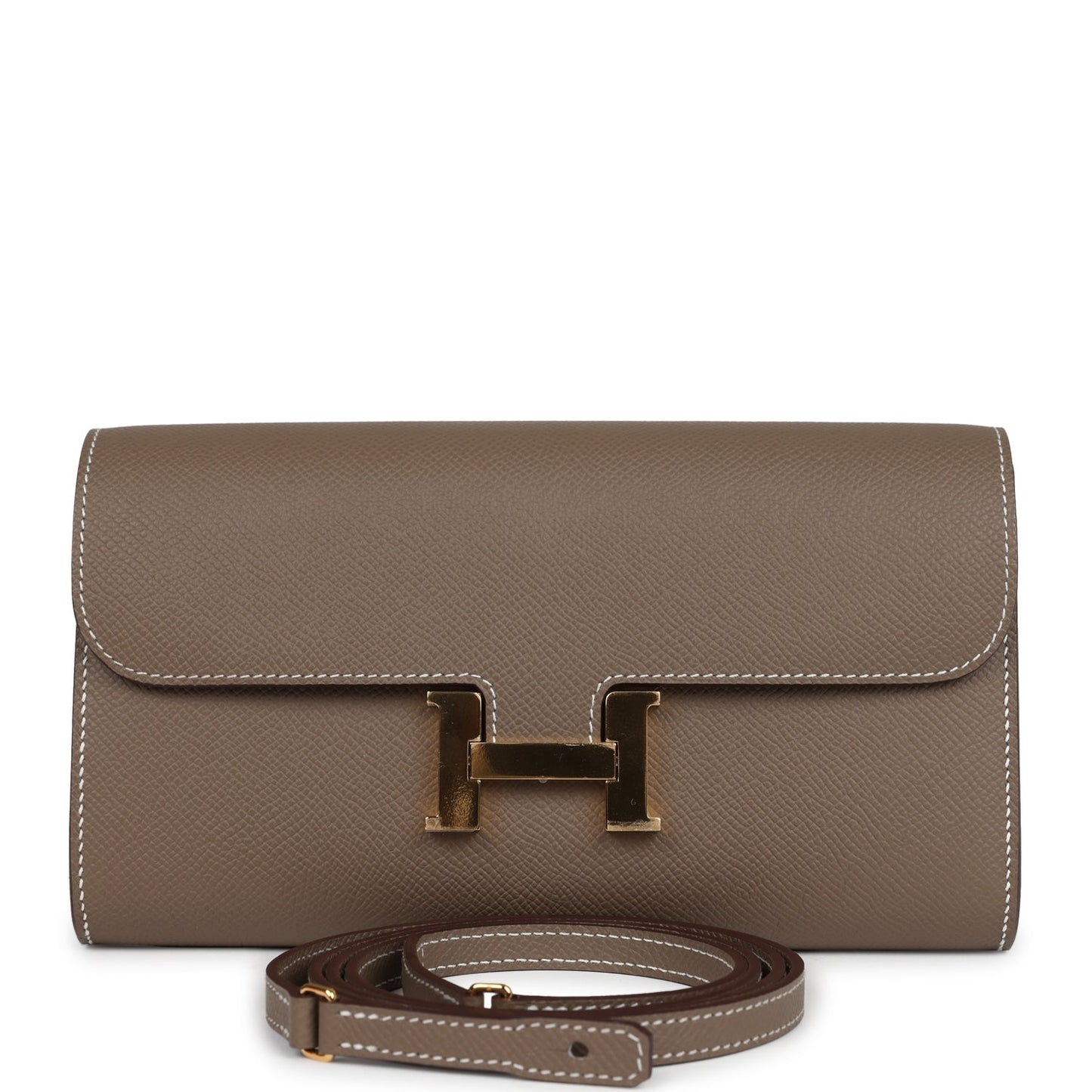 This Constance Wallet To Go is in Etoupe epsom leather with gold hardware and has contrast stitching, metal "H" snap lock closure, open front compartment and removable crossbody strap.