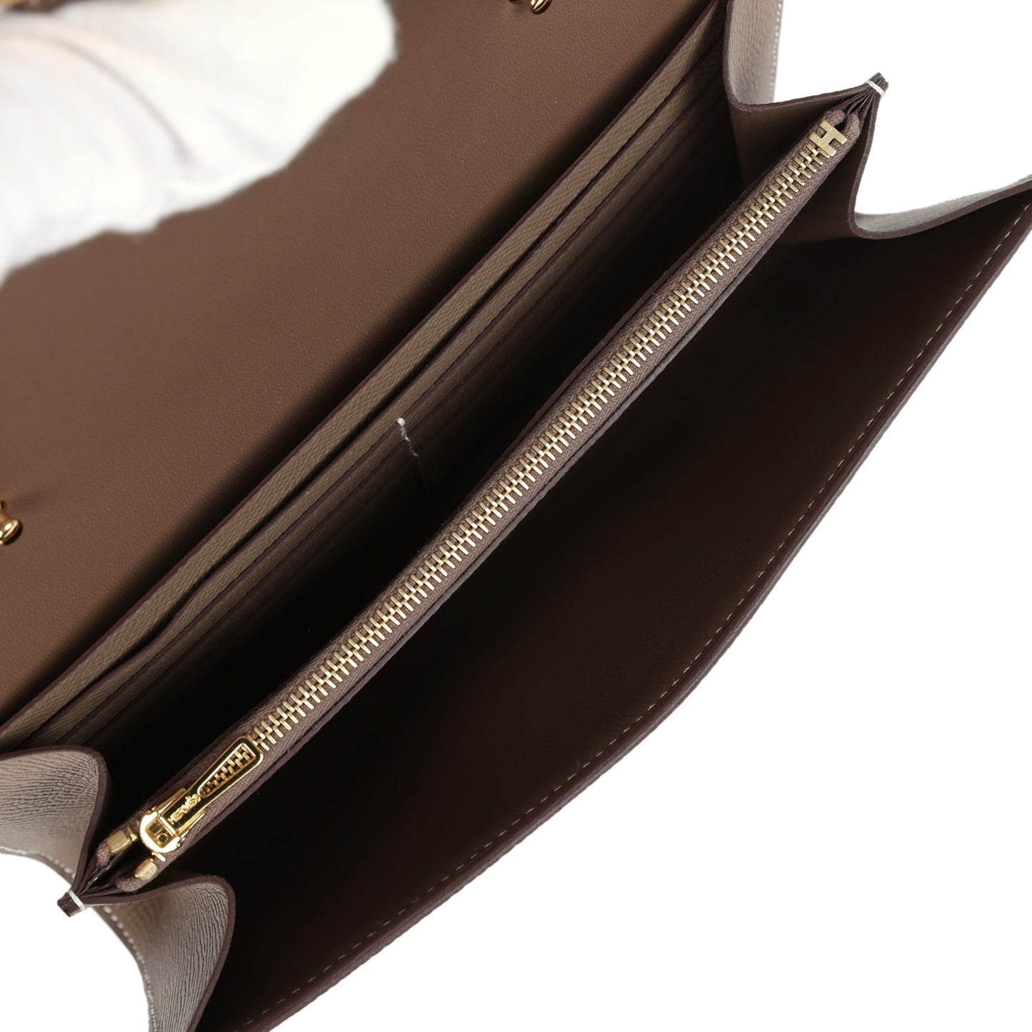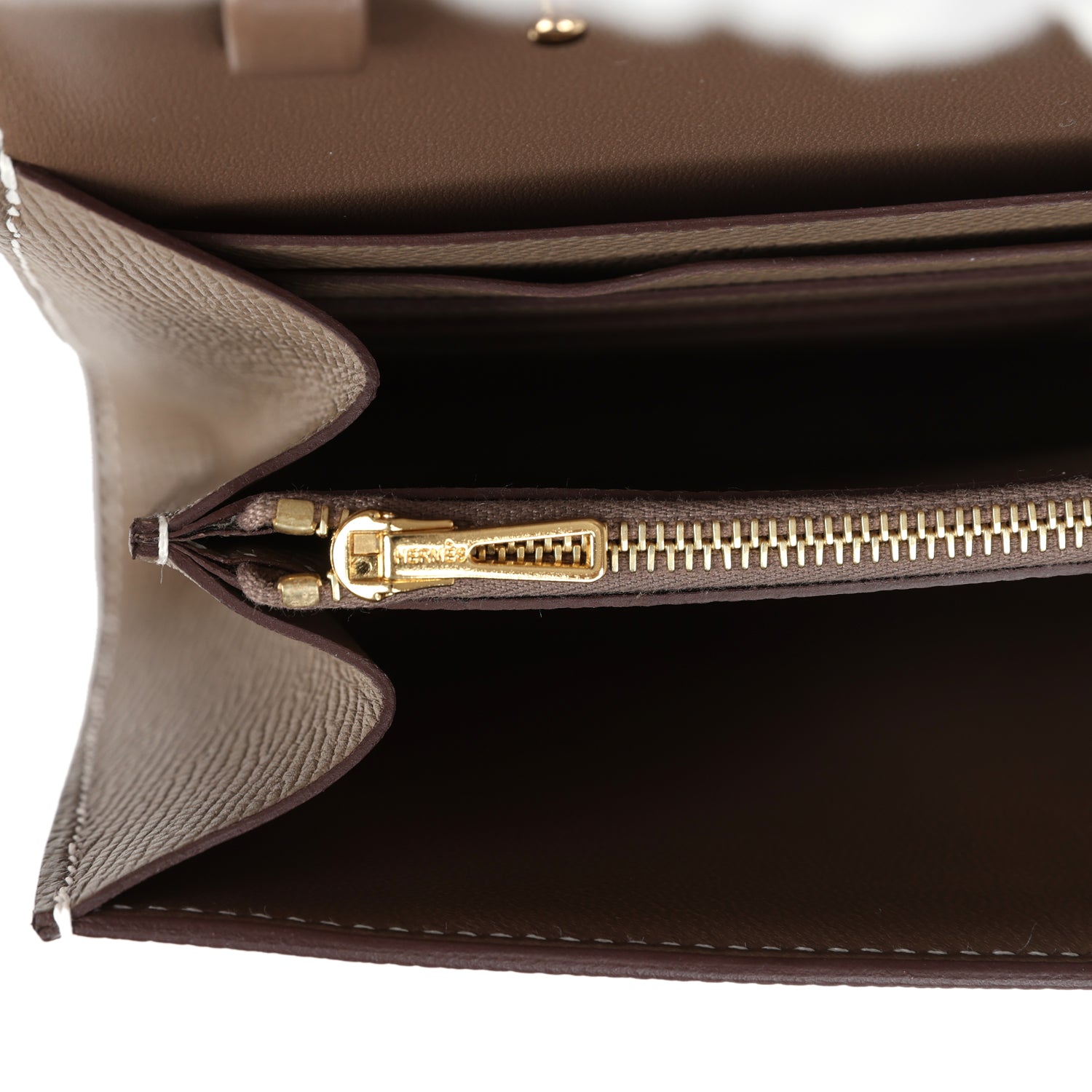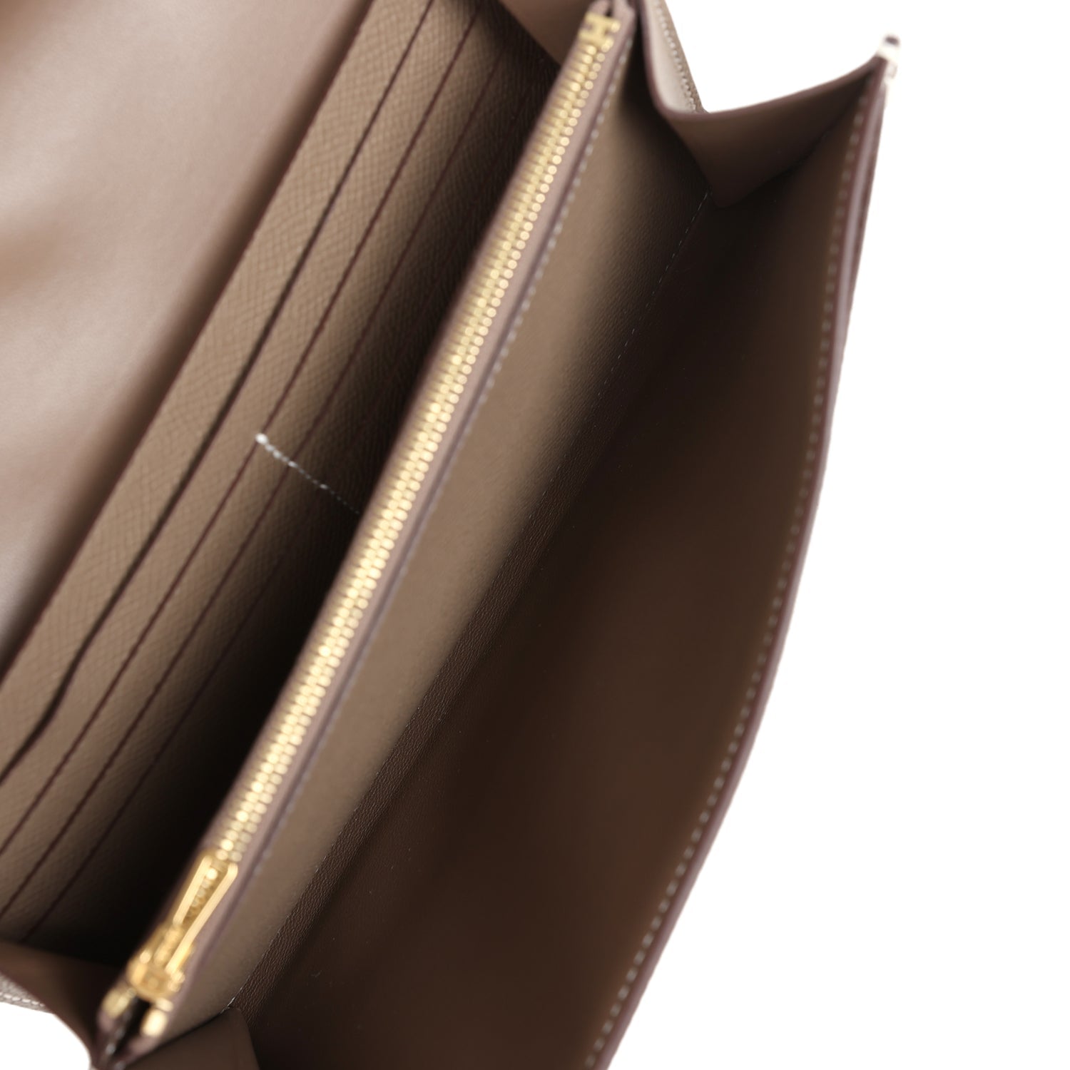 The interior is lined with Etoupe leather and two main compartments with six credit card slots and a zippered center compartment with Hermes H lock pull.