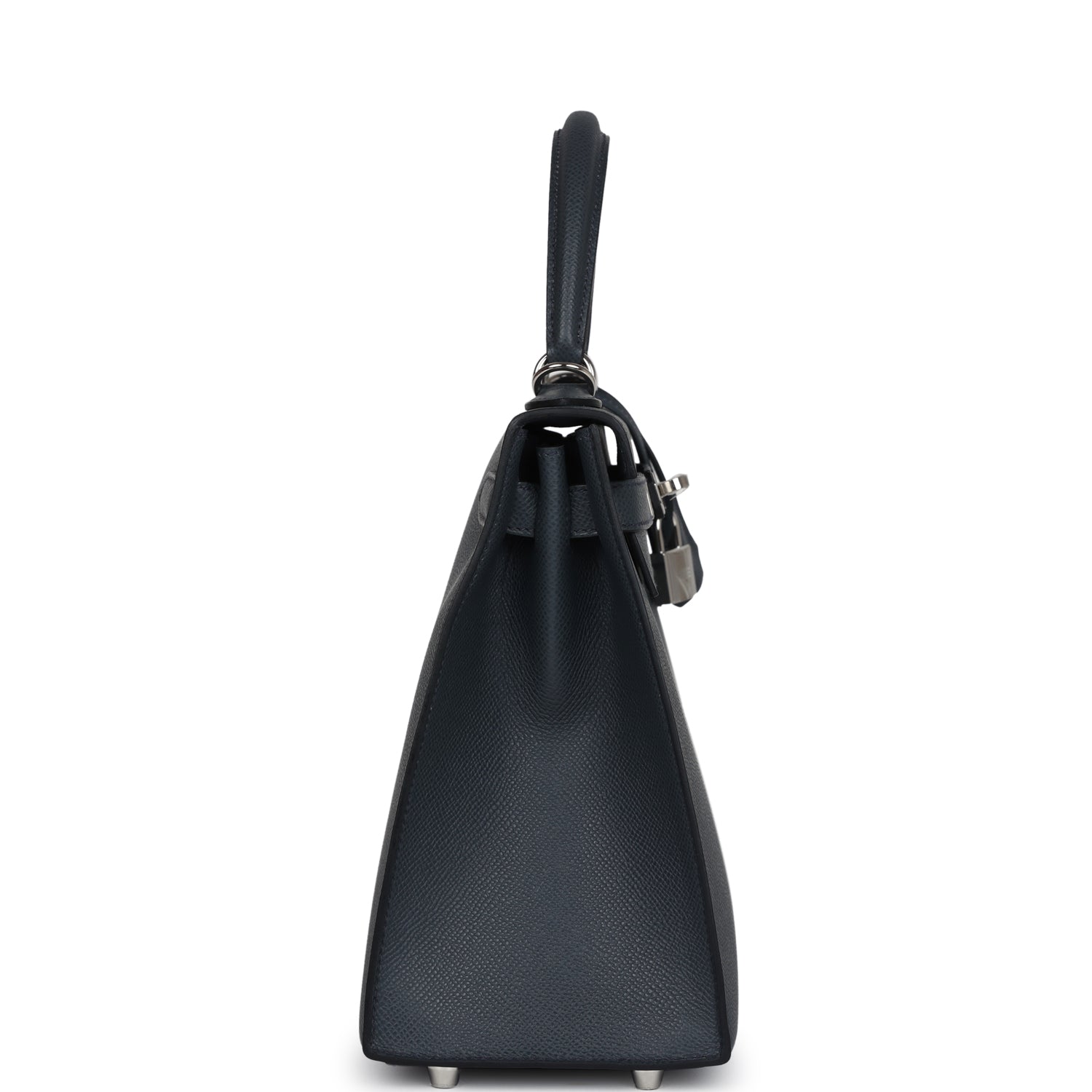 This Kelly 28, in the Sellier style, is in Gris Misty epsom leather with palladium hardware and has tonal stitching, front flap with two straps, front toggle closure, clochette with lock and two keys, and single rolled handle.