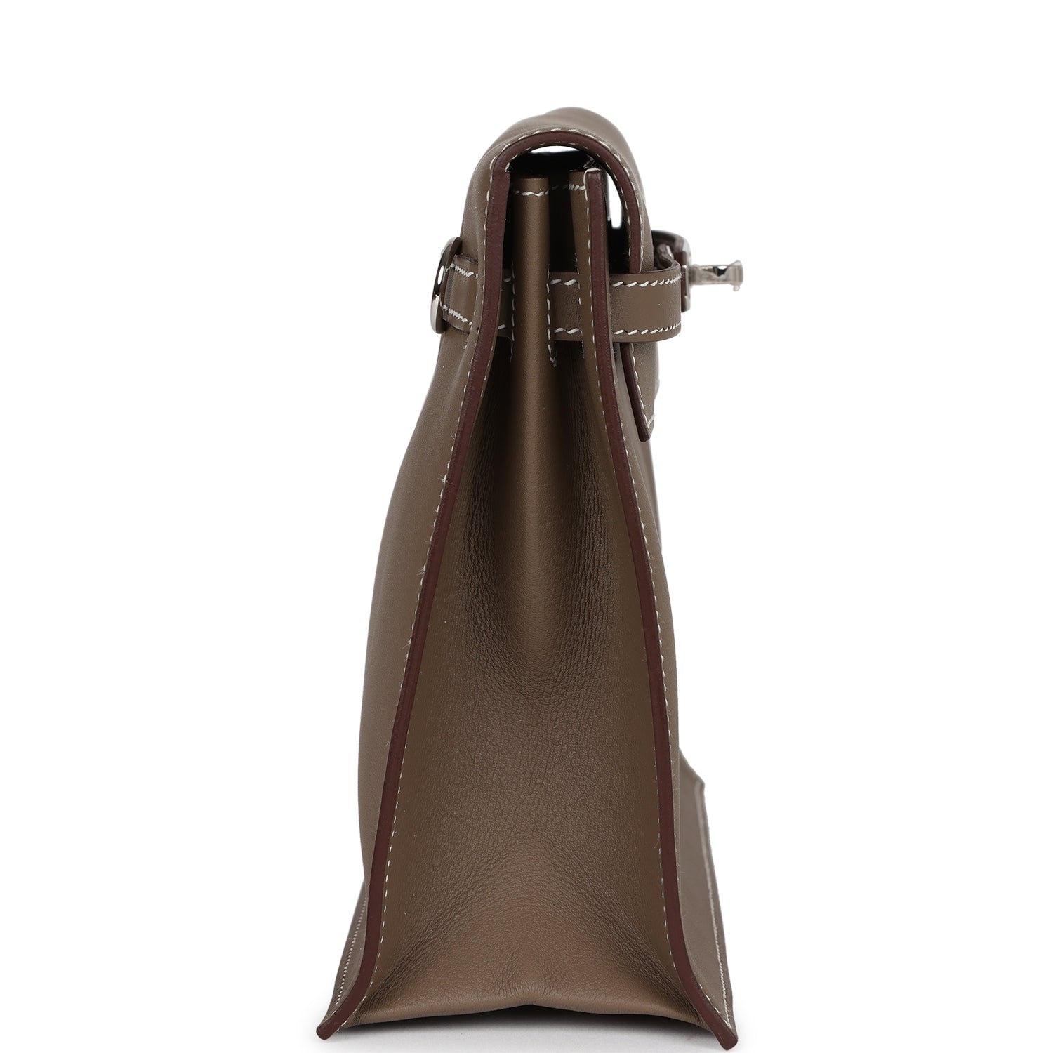 This Kelly Danse II is in Etoupe swift leather with palladium hardware and has contrast stitching, two straps with front flap closure and an adjustable flat shoulder strap for multi-style wear.