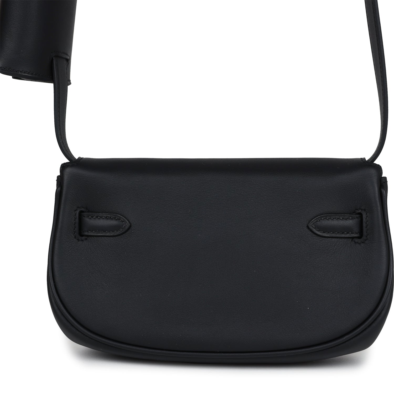 This Kelly Moove Black swift calfksin leather with gold hardware and features tonal stitching, round half moon shape, pull straps that attaches to a toggle closure, and an adjustable flat leather strap with small pouch.
