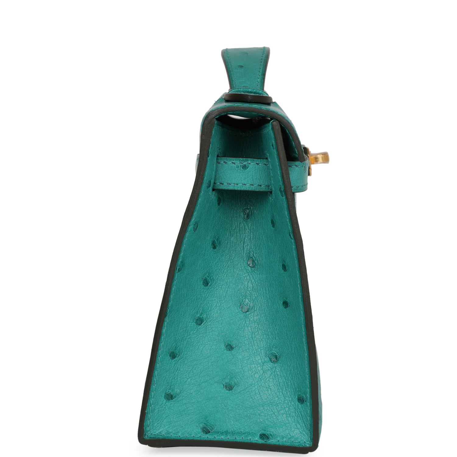 This Mini Kelly Pochette is in Vert Verone ostrich with gold hardware and has tonal stitching, front flap, two straps with center toggle closure and a top flat handle.