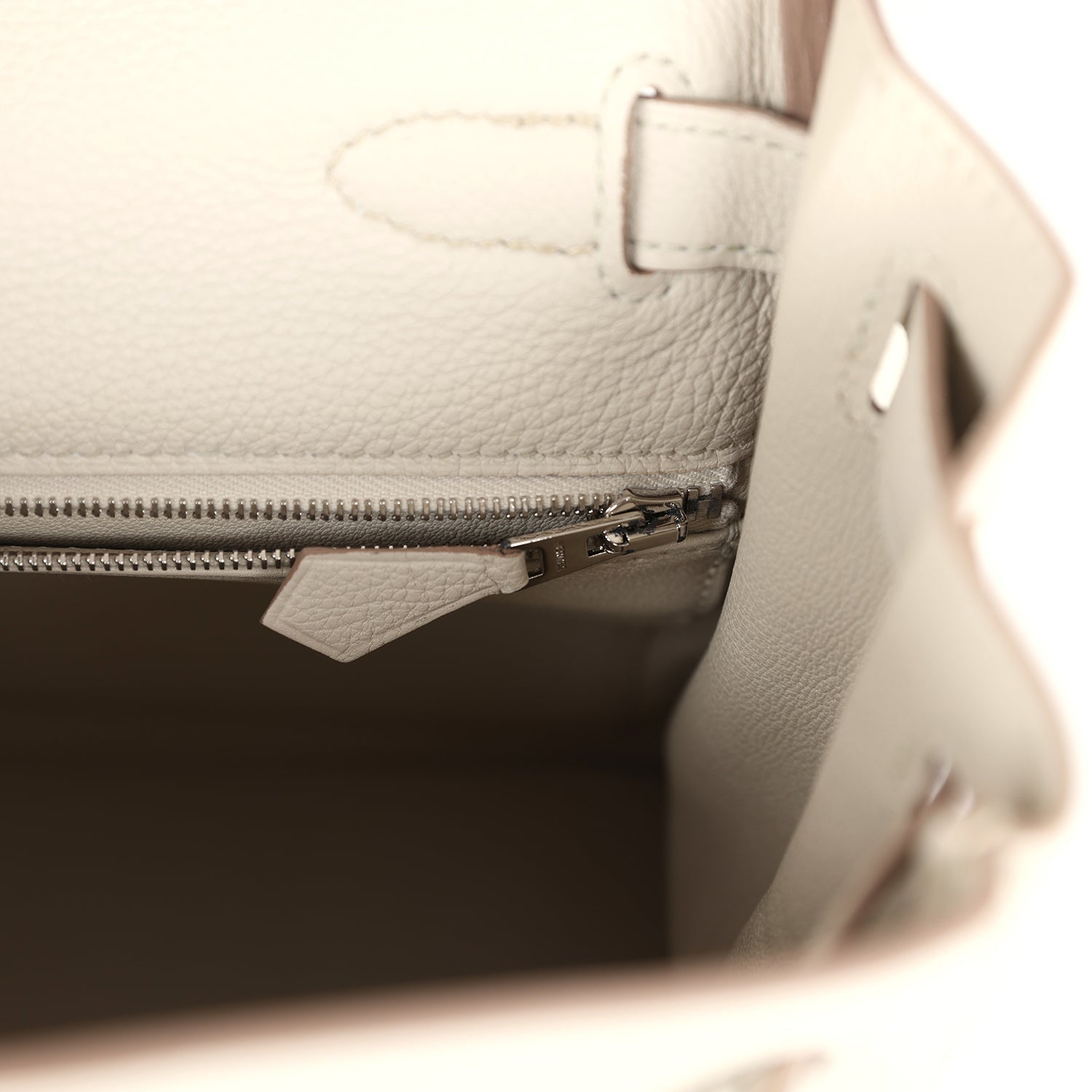 The interior is lined in Beton chevre and has one zip pocket with Hermes engraved pull and two open pockets on the opposite side.