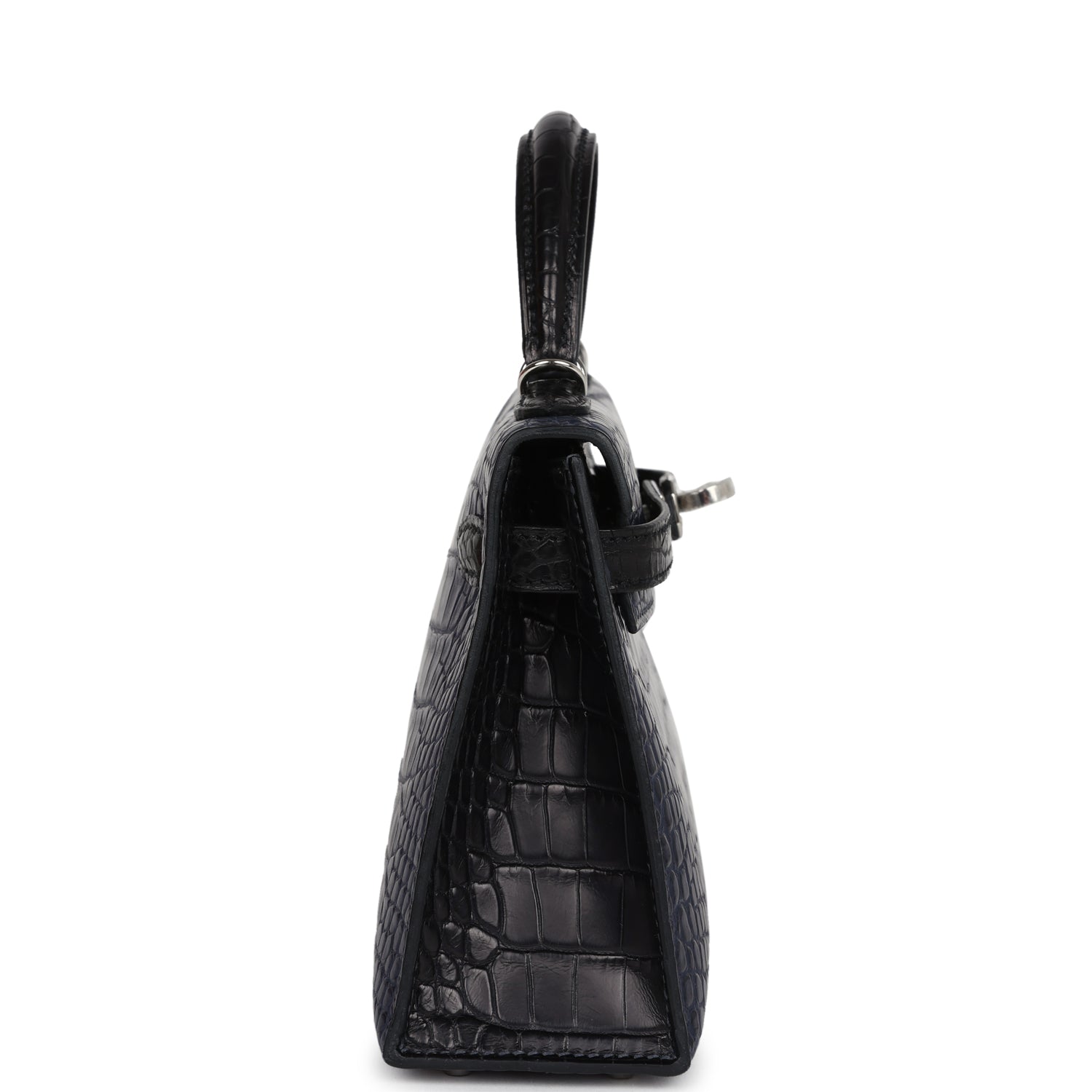 This Kelly, in the Sellier style, is in Bleu Indigo and Black Matte Alligator Mississippiensis leather with palladium hardware and has tonal stitching, two straps with front toggle closure, single rolled handle and removable shoulder strap.
