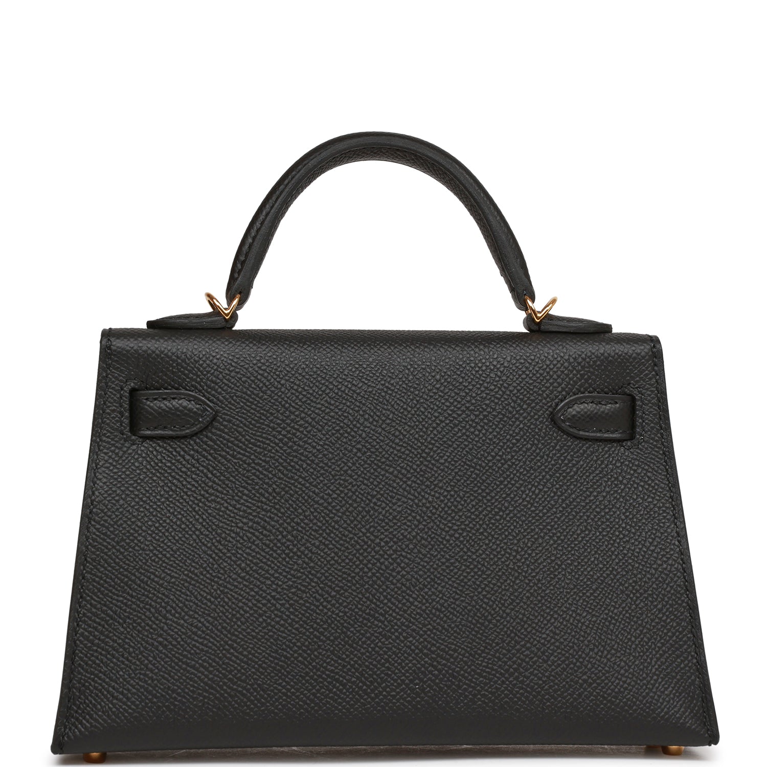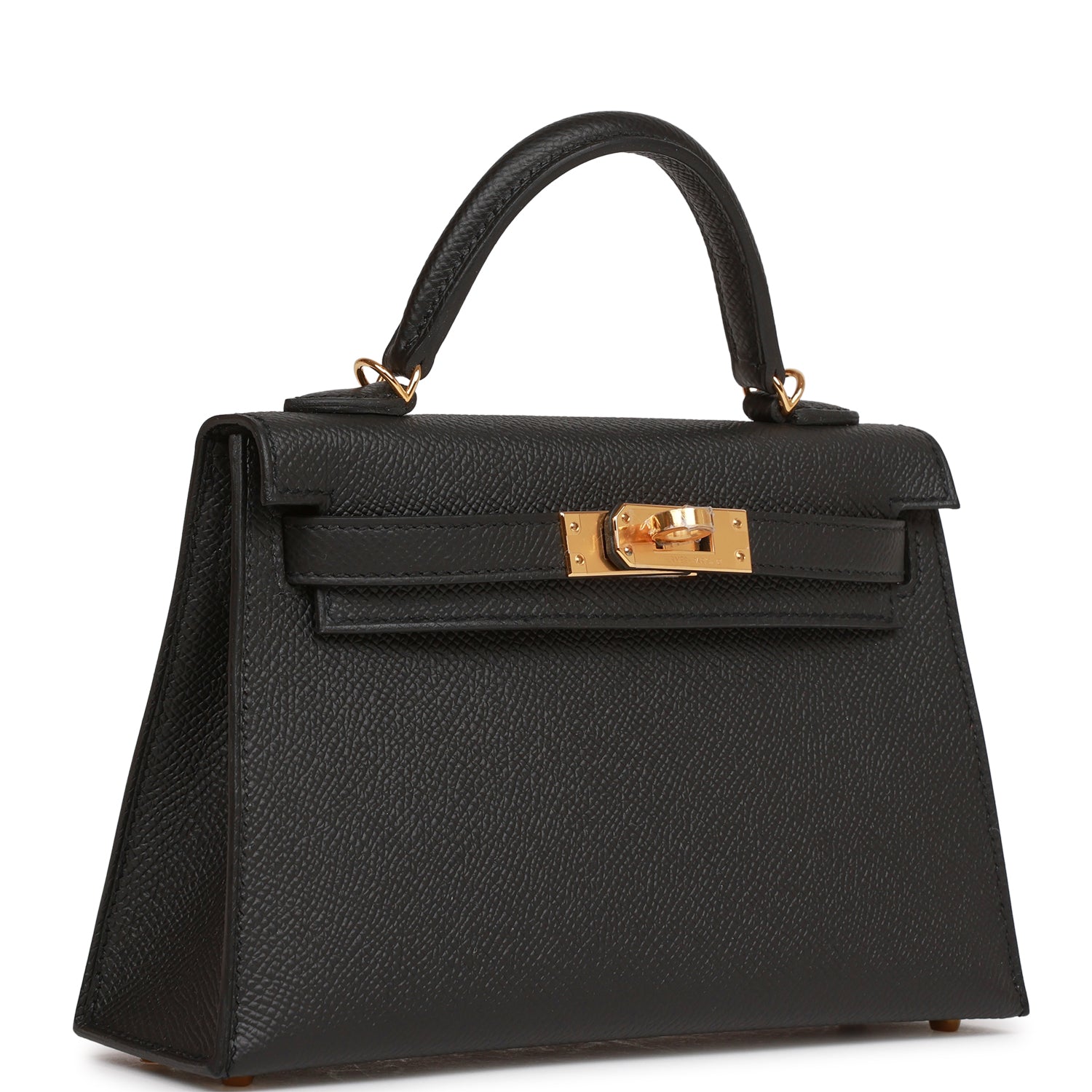 This tiny Kelly, in the Sellier style, is in black epsom leather with gold hardware and has tonal stitching, two front straps with front toggle closure, single rolled handle and removable shoulder strap.