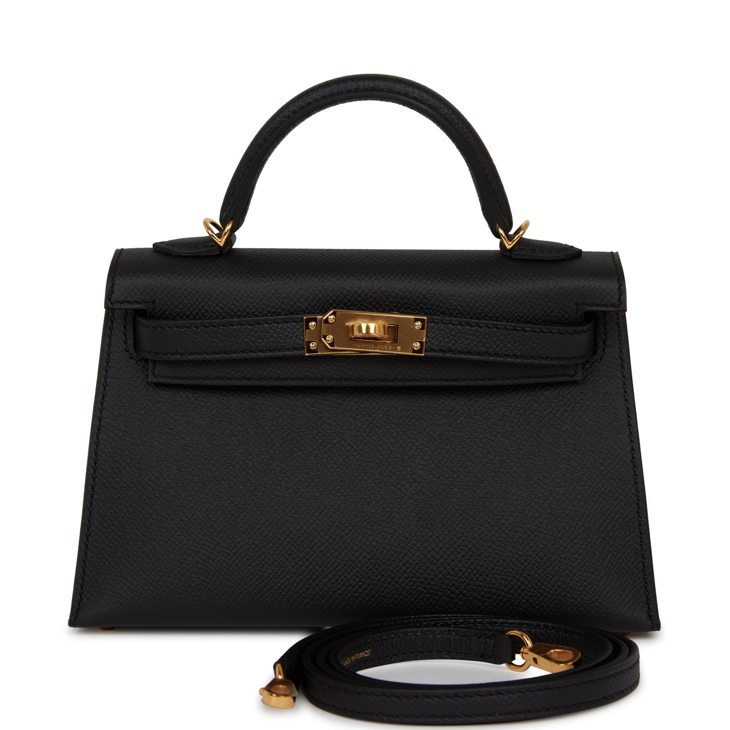 This tiny Kelly, in the Sellier style, is in black epsom leather with gold hardware and has tonal stitching, two front straps with front toggle closure, single rolled handle and removable shoulder strap.