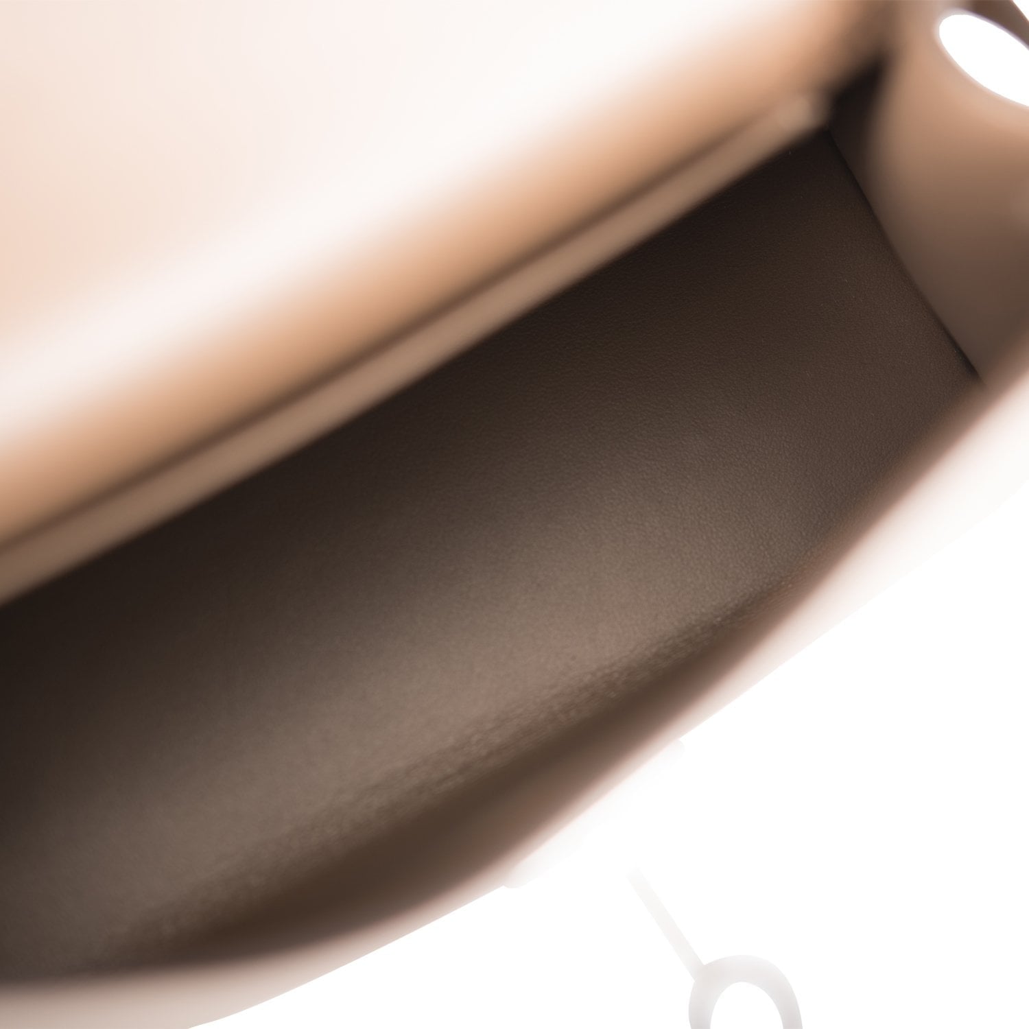 The interior is lined with Etoupe lambskin leather and has one open pocket on the back wall.