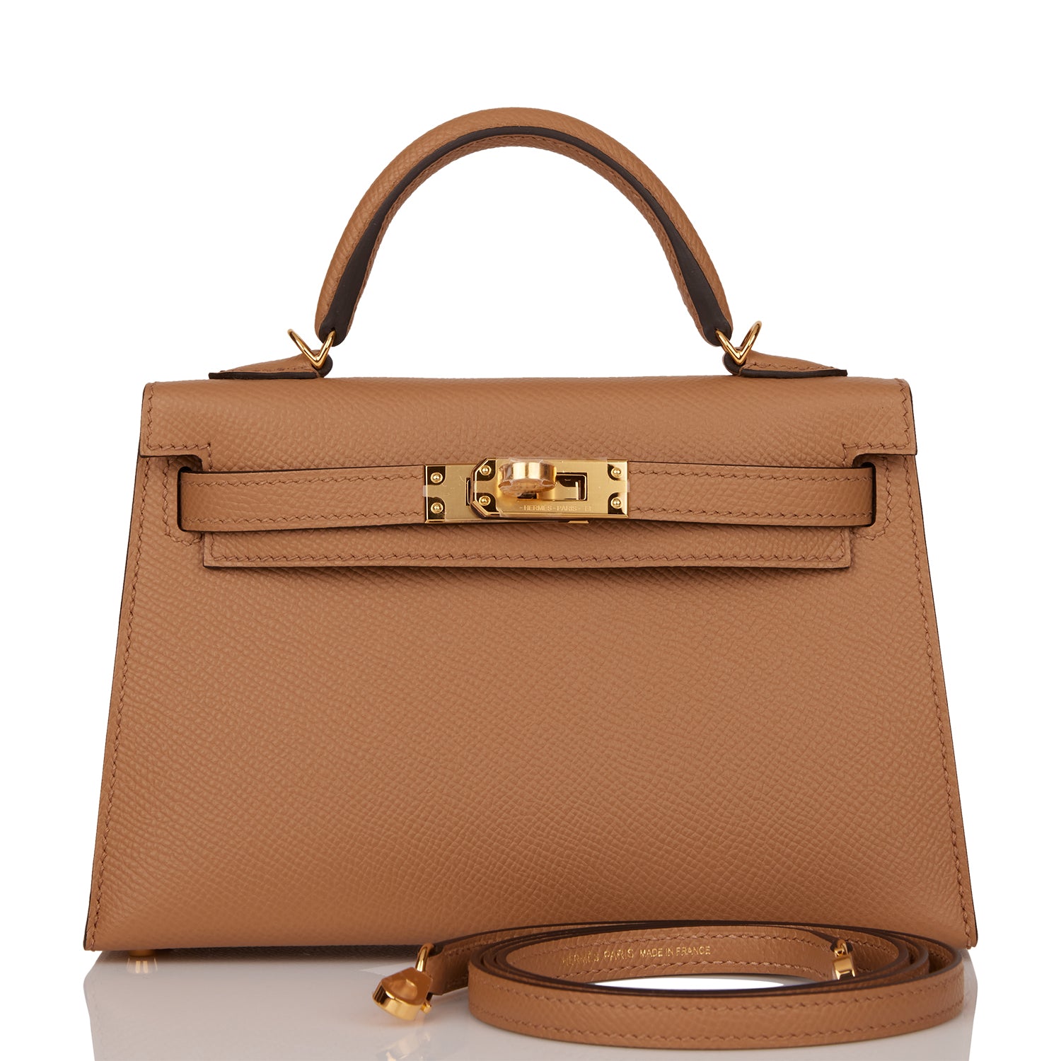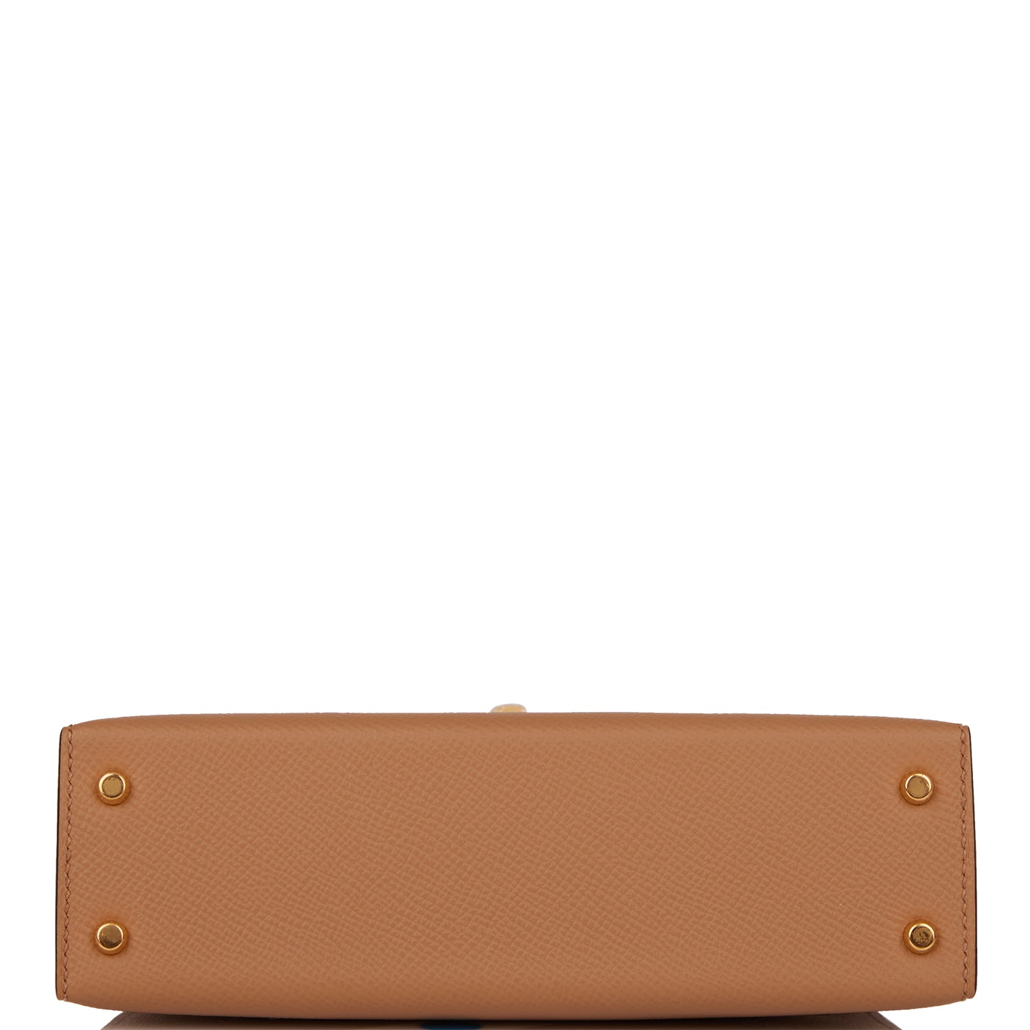 This tiny Kelly, in the Sellier style, is in Chai epsom leather with gold hardware and has tonal stitching, two front straps with front toggle closure, single rolled handle and removable shoulder strap.
