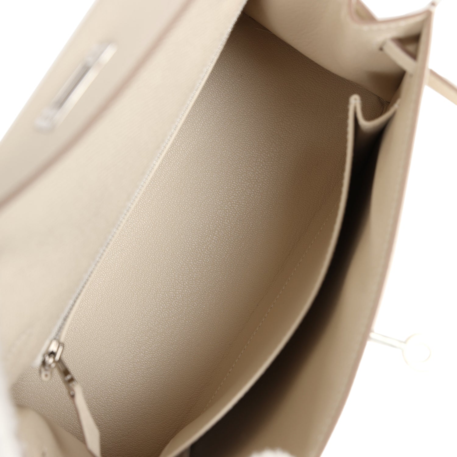 The interior is lined with Craie chevre leather and features one zip pocket with an Hermes engraved pull and one open pocket on the opposite side.