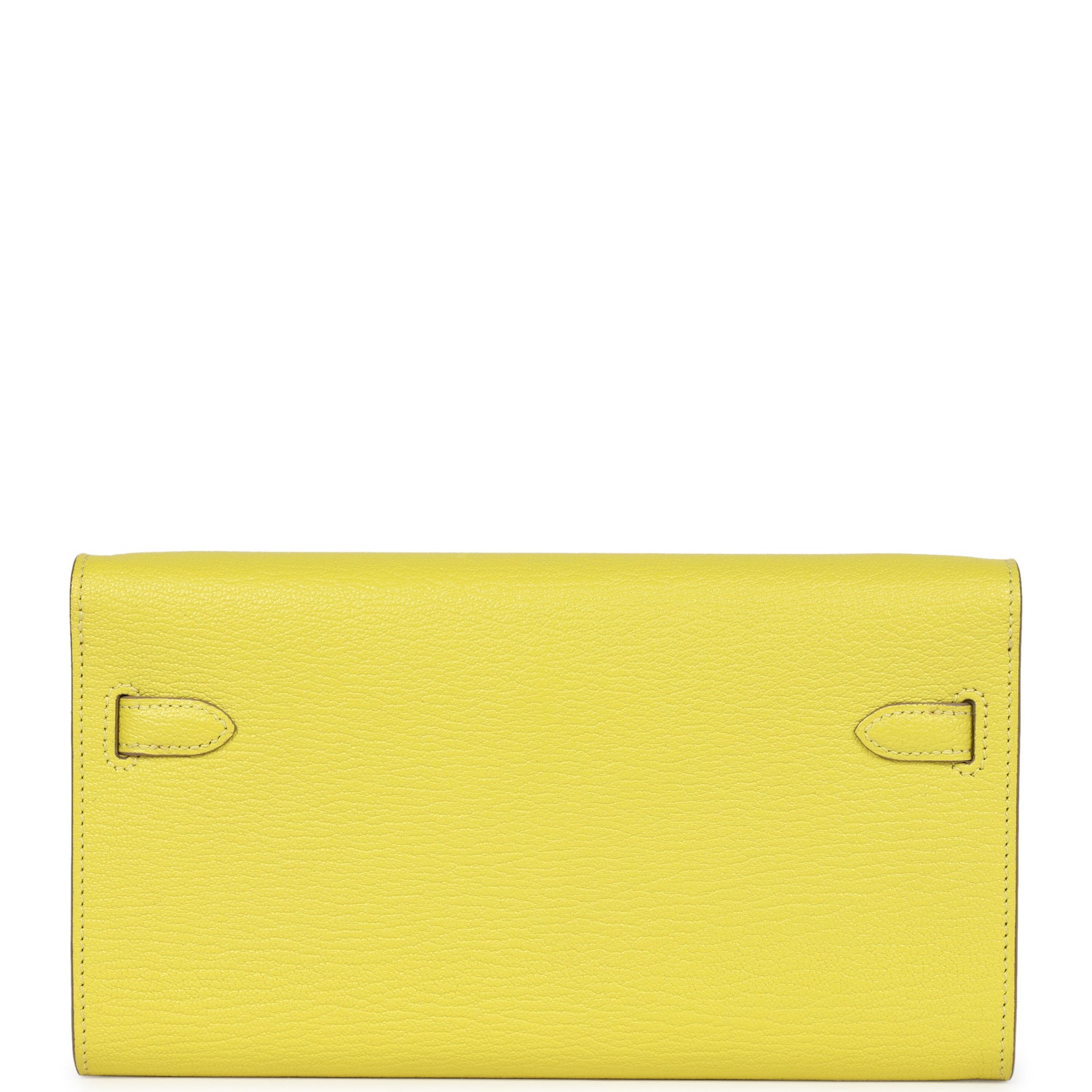 This Kelly Wallet To Go is in Lime chevre leather with palladium hardware and has tonal stitching, two straps with front toggle closure and removable crossbody strap.