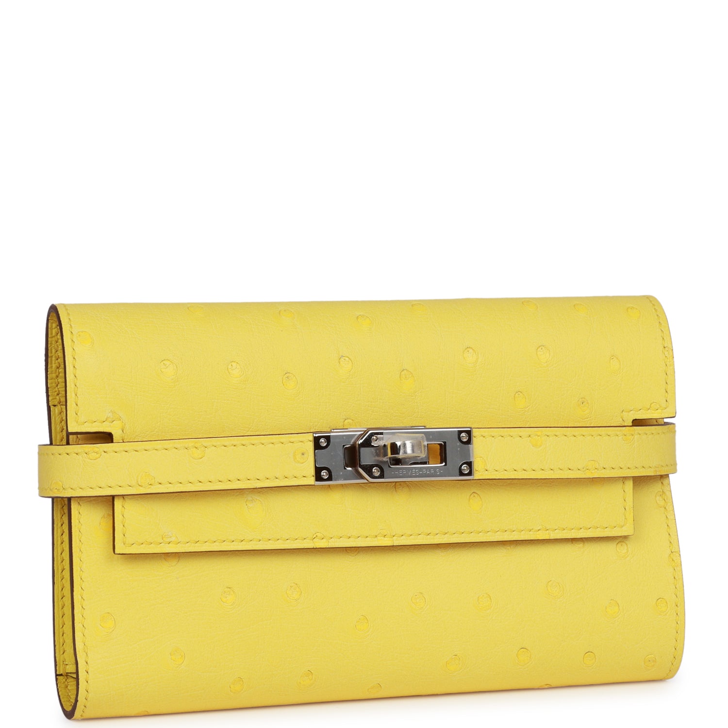 This Kelly Medium Depliant Wallet is in Jaune Citron ostrich with palladium hardware and has tonal stitching, front flap and two straps with front toggle closure.