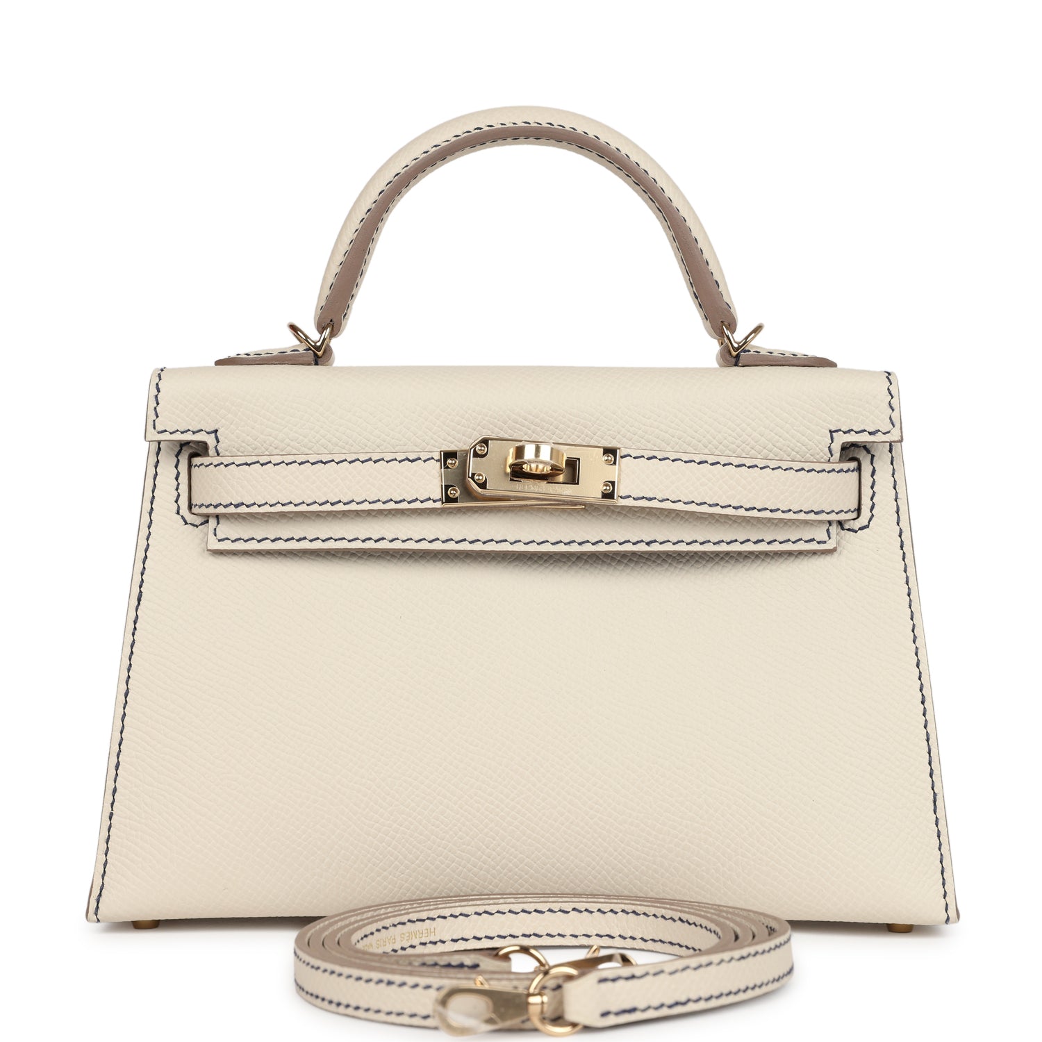 This Special Order Kelly, in the Sellier style, is in Craie and Bleu Saphir epsom leather with permabrass hardware, has contrast Bleu Saphir stitching, two front straps with front toggle closure, single rolled handle and removable shoulder strap.
