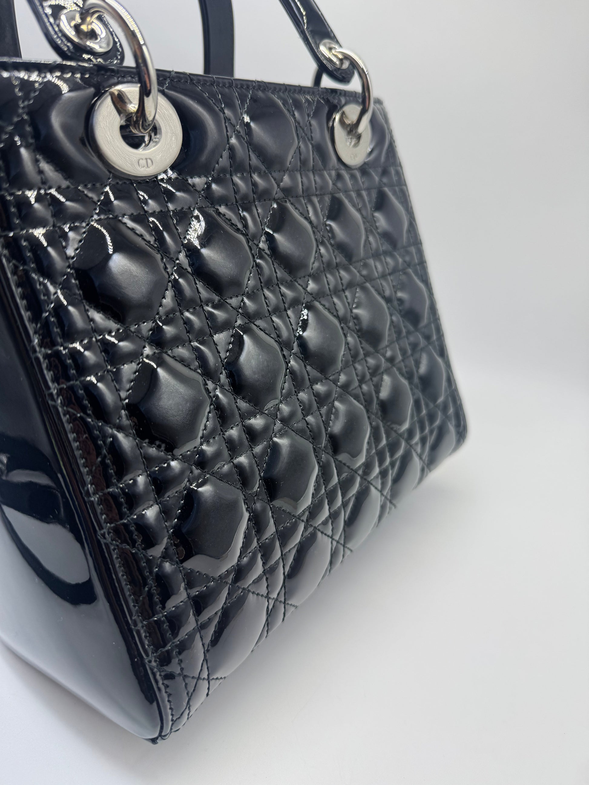 Pre-owned Certified Dior Medium Lady Dior Black Patent Leather with Silver Hardware, 2015, w/ dust bag, strap