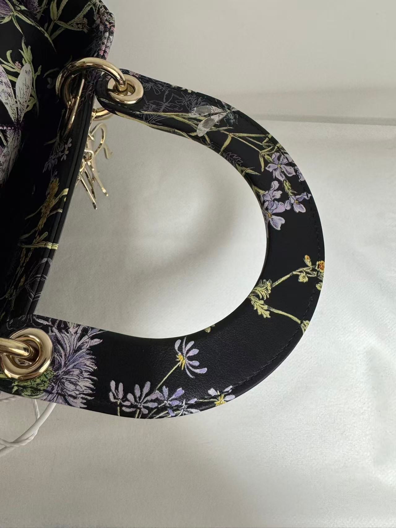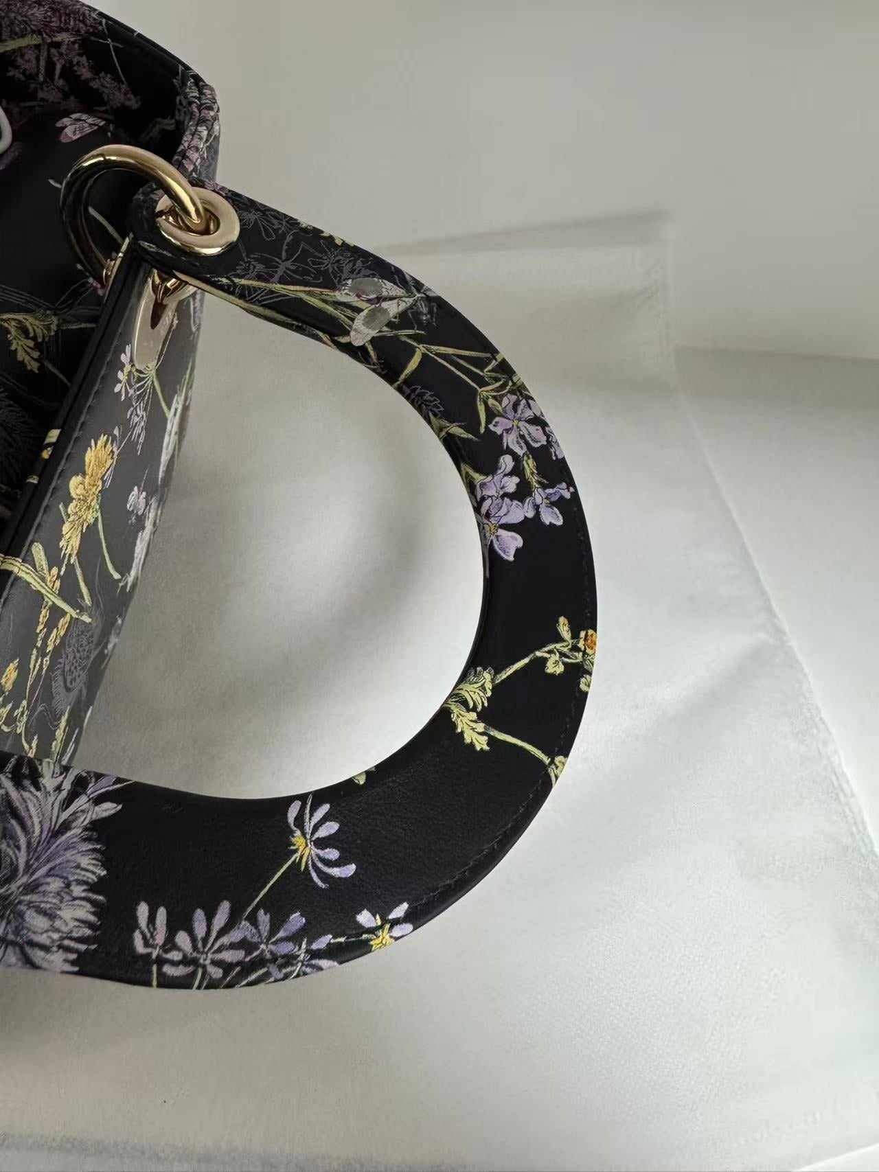 Pre-owned Certified Dior Small Lady Dior Black Calfskin with Painted Floral Pattern with Light Golden Hardware, 2024, w/ full set