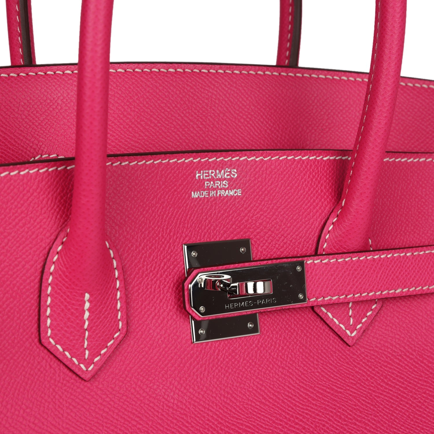This Birkin is in Rose Tyrien epsom with palladium hardware and has contrast stitching, front flap with two straps, front toggle closure, clochette with lock and two keys, double rolled handles.
