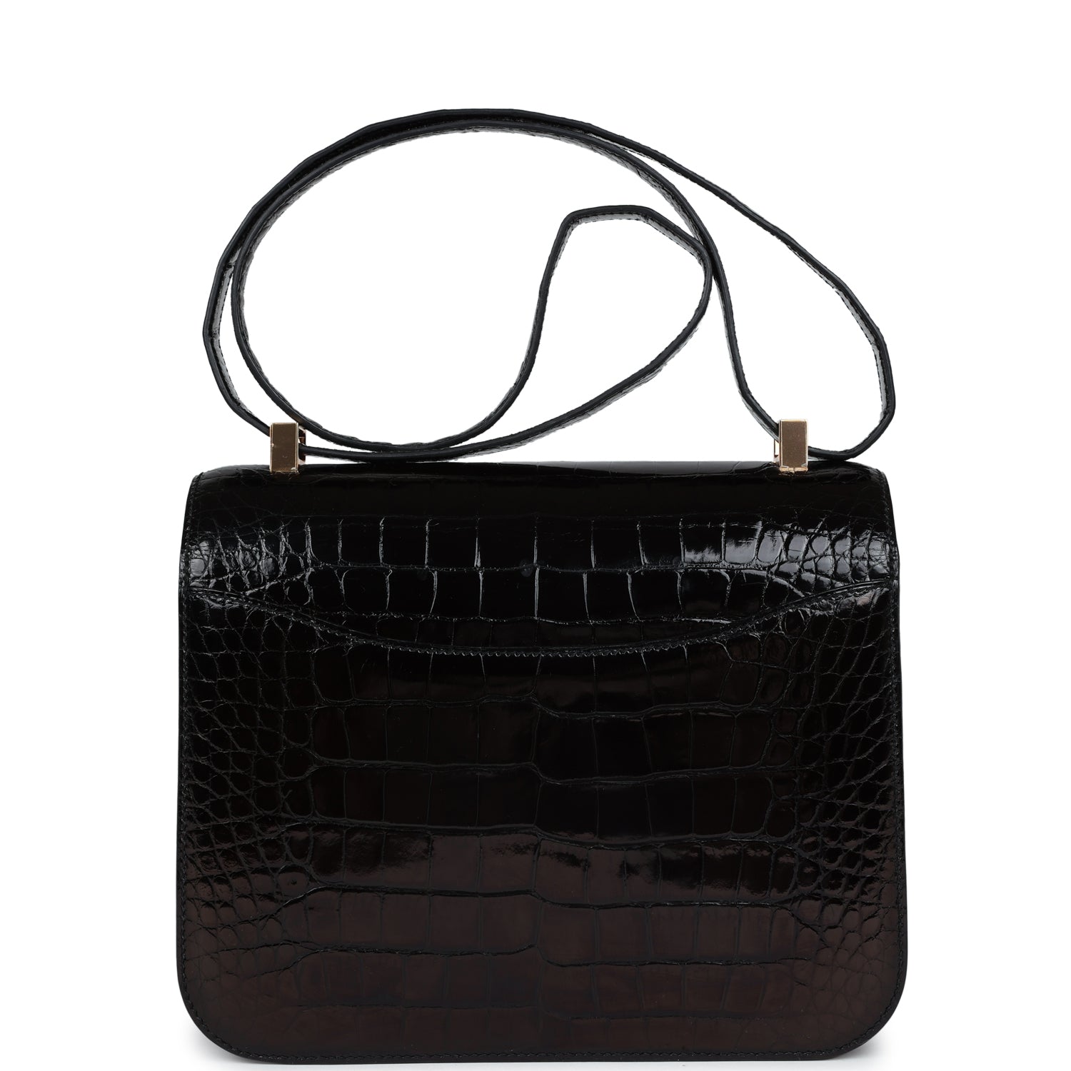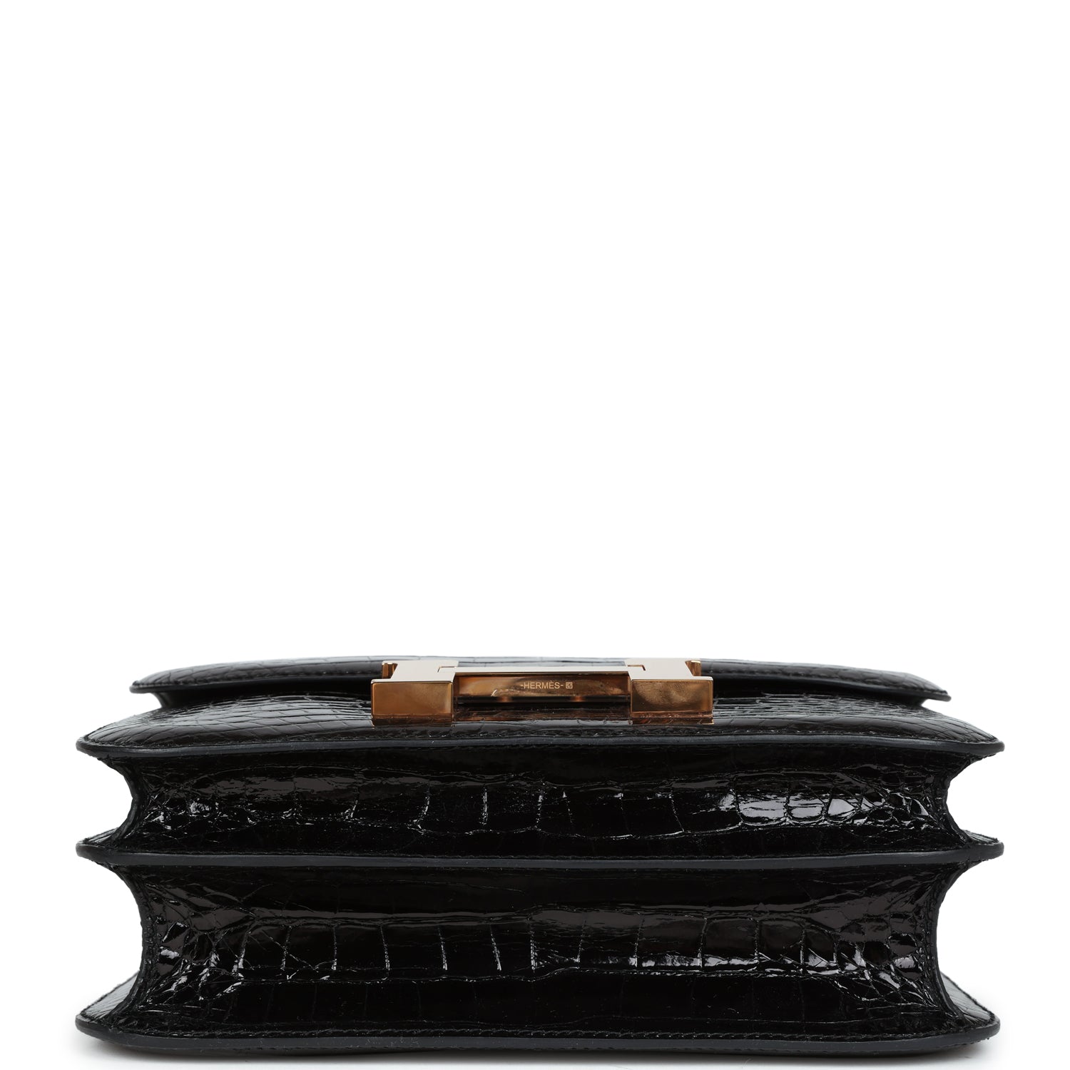 This Constance is of Black shiny alligator with rose gold hardware and features tonal stitching, a "H" snap lock closure, and an adjustable shoulder strap.